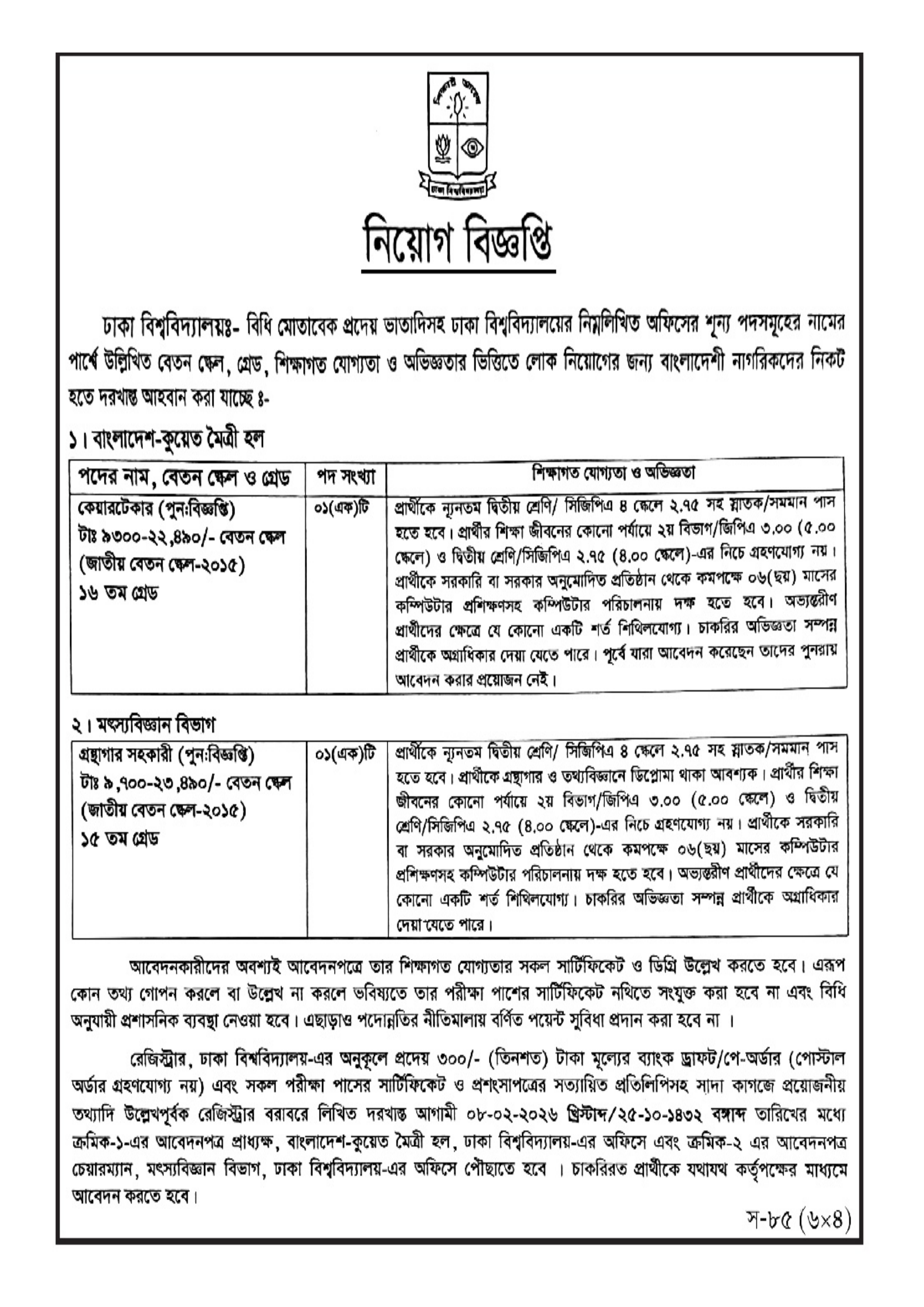 ঢাকা বিশ্ববিদ্যালয়ের অধীনে বাংলাদেশ-কুয়েত মৈত্রী হল এবং মৎস্যবিজ্ঞান বিভাগে জনবল নিয়োগের জন্য বিজ্ঞপ্তি প্রকাশ করা হয়েছে। আগ্রহী এবং যোগ্য বাংলাদেশী নাগরিকদের নিকট হতে আবেদন আহ্বান করা হচ্ছে।
