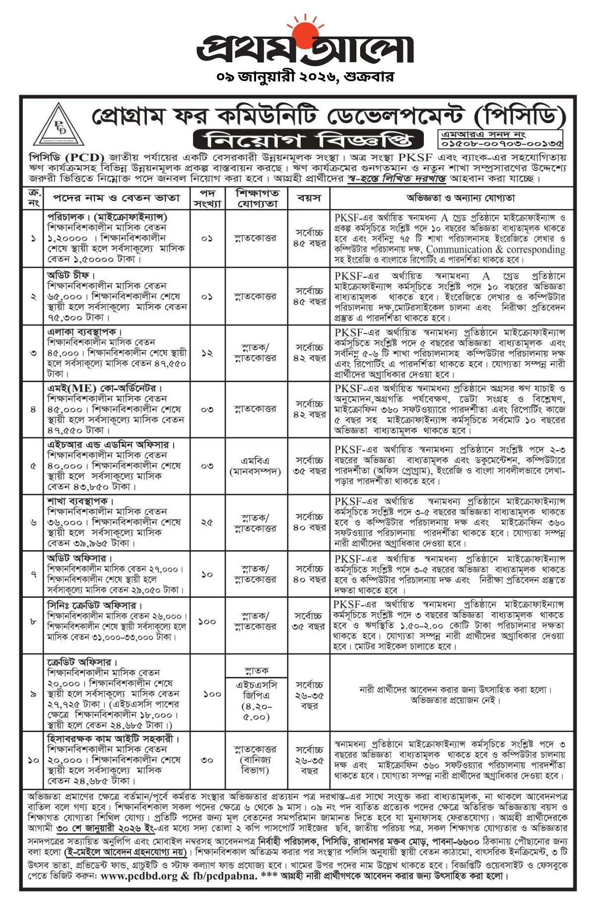বাংলাদেশের চাকরিপ্রার্থীদের জন্য নতুন বছরের শুরুতেই সুখবর নিয়ে এলো দেশের অন্যতম শীর্ষস্থানীয় এনজিও। NGO Job Circular খুঁজছেন এমন প্রার্থীদের জন্য প্রোগ্রাম ফর কমিউনিটি ডেভেলপমেন্ট (PCD) বিশাল নিয়োগ বিজ্ঞপ্তি প্রকাশ করেছে। মাইক্রোফাইন্যান্স এবং অডিট সেকশনে দক্ষ জনবল নিয়োগের এই বিজ্ঞপ্তিতে আকর্ষণীয় বেতন ও সুযোগ-সুবিধা ঘোষণা করা হয়েছে।