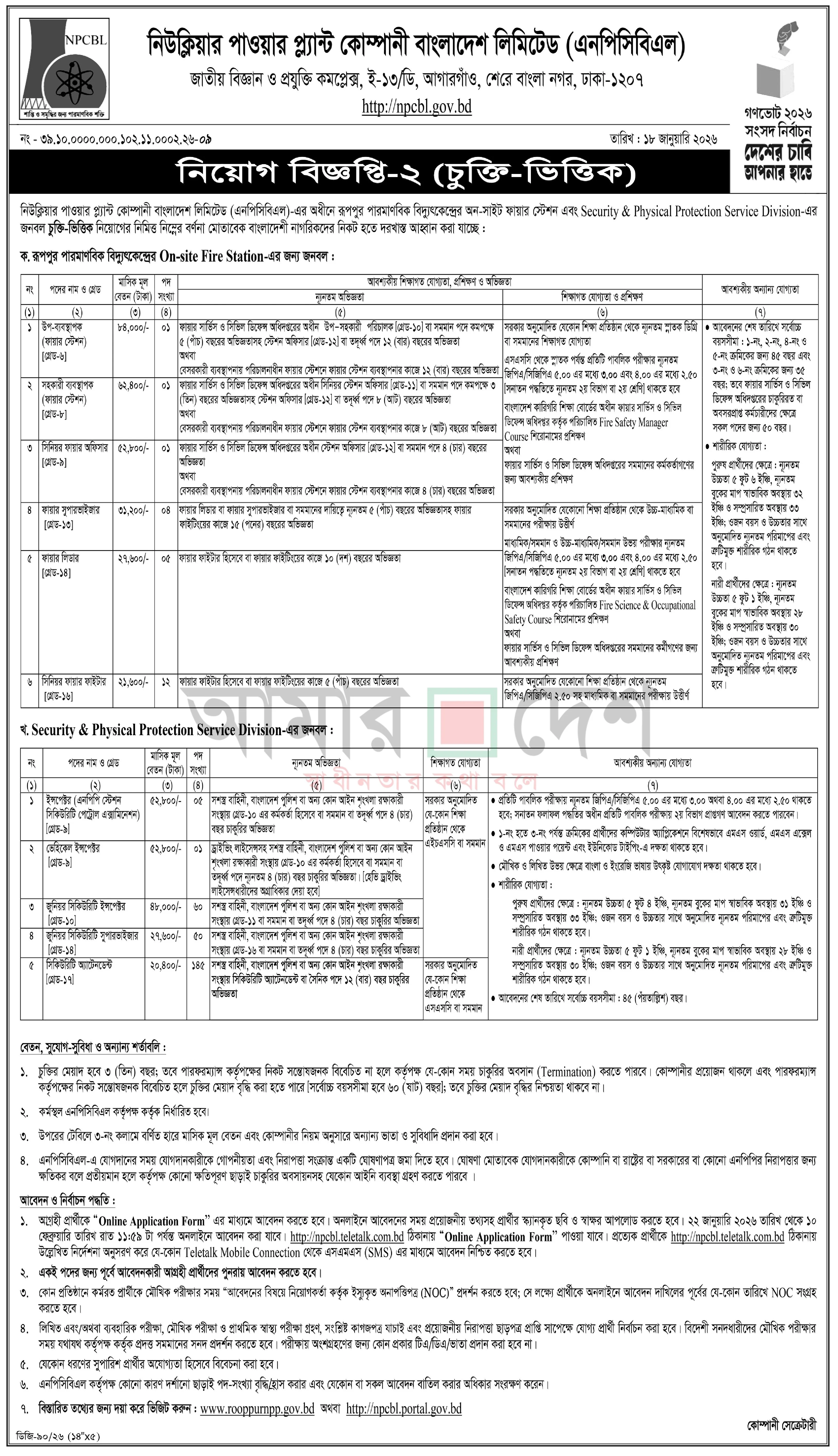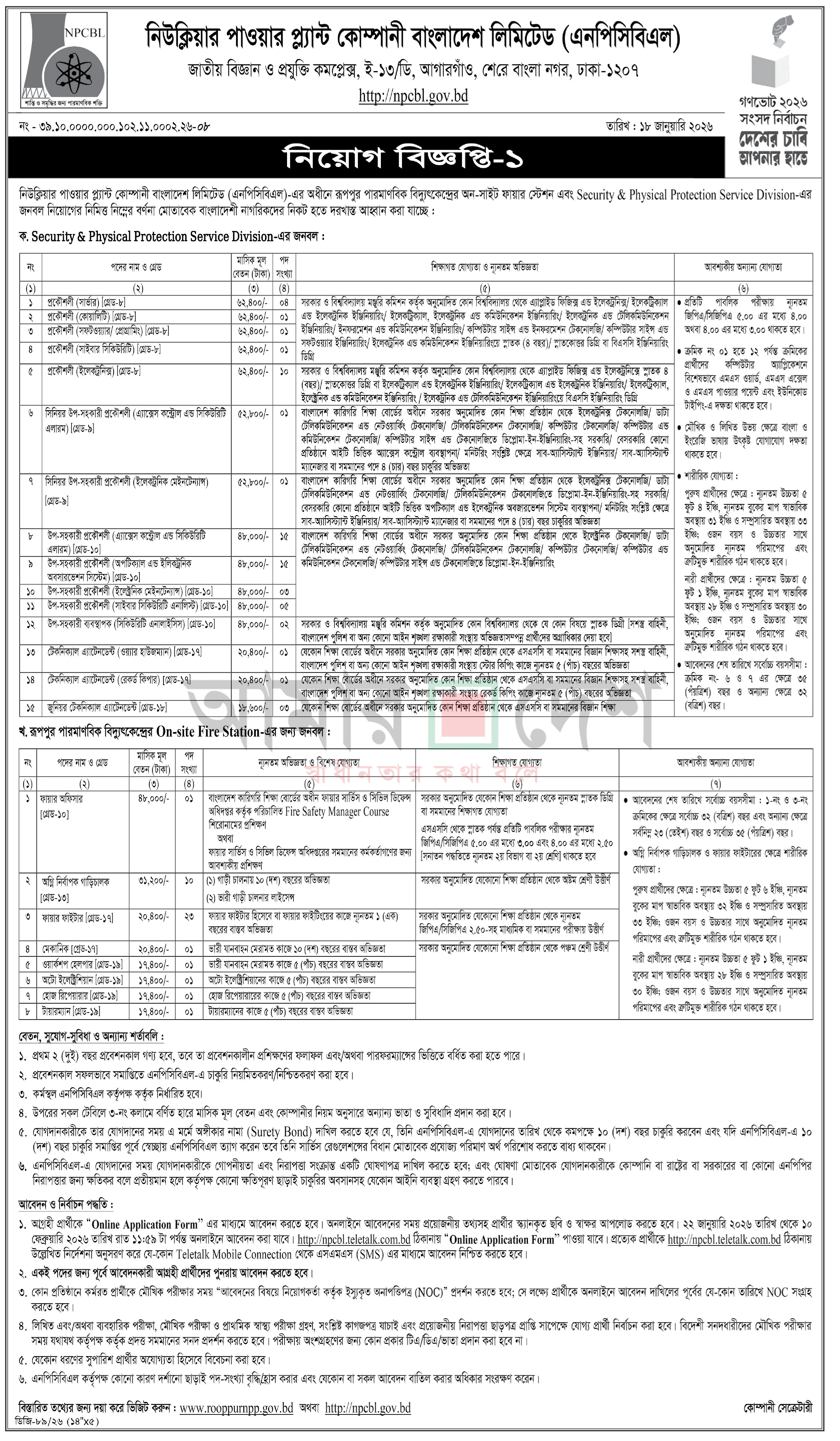 নিউক্লিয়ার পাওয়ার প্ল্যান্ট কোম্পানী বাংলাদেশ লিমিটেড (এনপিসিবিএল) (npcbl Job Circular 2026) তাদের বিভিন্ন বিভাগ ও প্রকল্পের জন্য বিশাল নিয়োগ বিজ্ঞপ্তি প্রকাশ করেছে। রূপপুর পারমাণবিক বিদ্যুৎকেন্দ্রের বিভিন্ন শূন্যপদে দক্ষ জনবল নিয়োগের লক্ষ্যে যোগ্য বাংলাদেশী নাগরিকদের নিকট হতে অনলাইনে আবেদন আহ্বান করা যাচ্ছে।