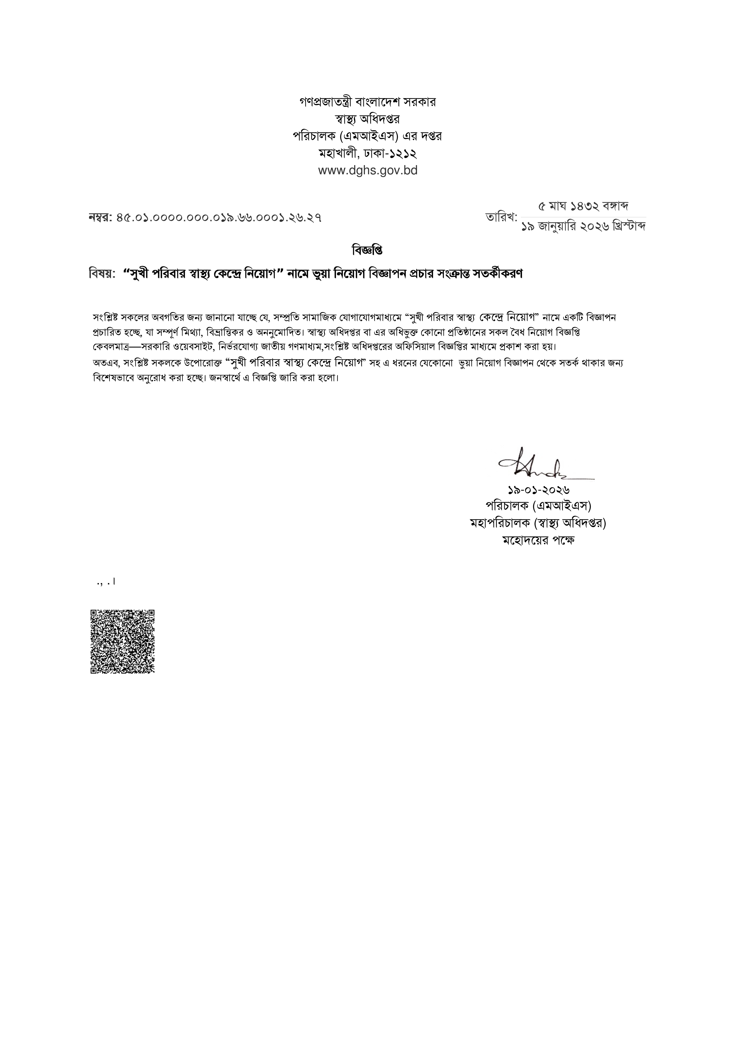 স্বাস্থ্য অধিদপ্তর সম্প্রতি সামাজিক যোগাযোগমাধ্যমে প্রচারিত “সুখী পরিবার স্বাস্থ্য কেন্দ্রে নিয়োগ” নামক একটি বিজ্ঞাপনকে সম্পূর্ণ মিথ্যা, বিভ্রান্তিকর এবং অননুমোদিত বলে ঘোষণা করেছে। সংশ্লিষ্ট সকলকে এ ধরণের ভুয়া নিয়োগ বিজ্ঞপ্তি থেকে সতর্ক থাকার জন্য বিশেষভাবে অনুরোধ জানানো হয়েছে।