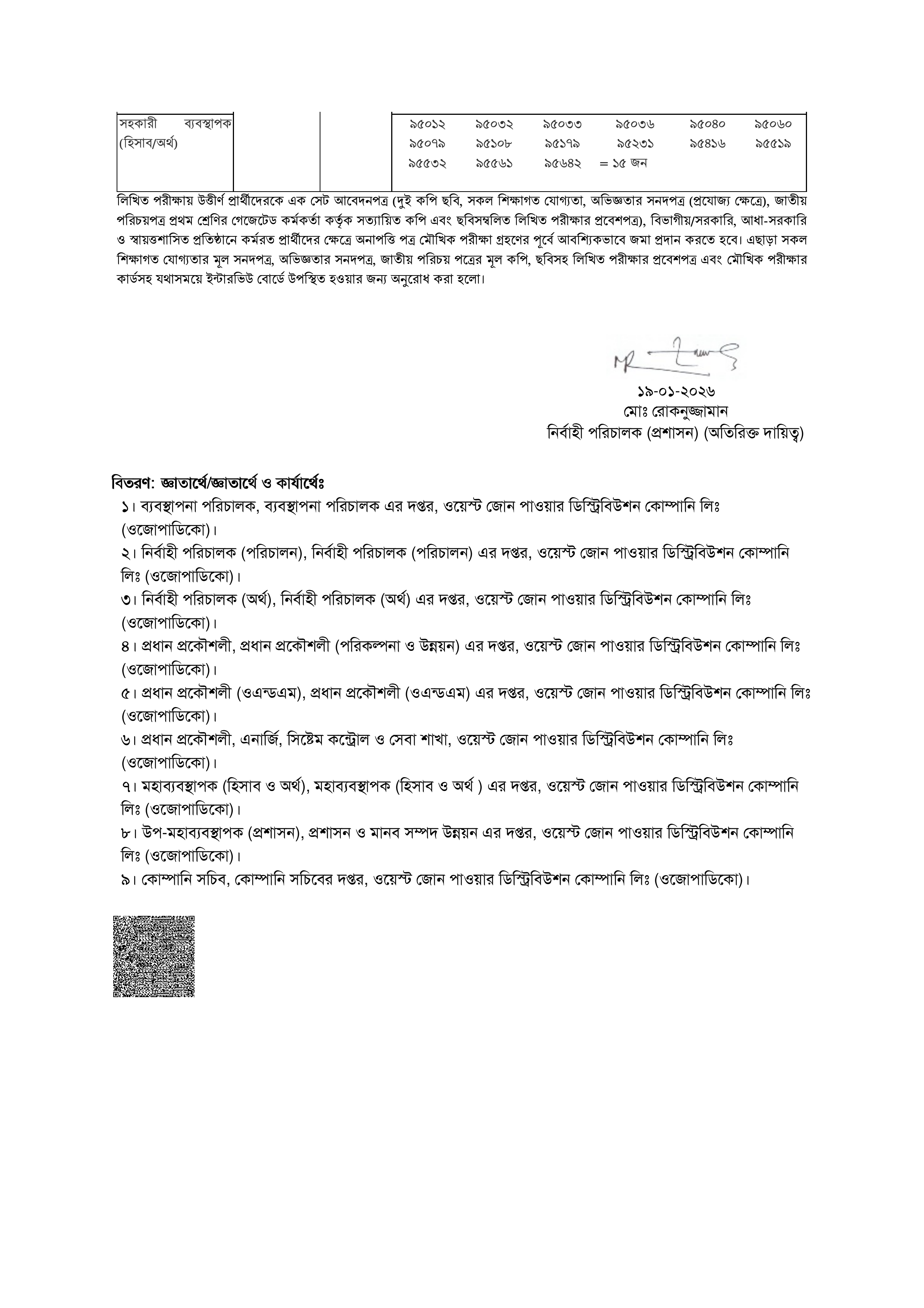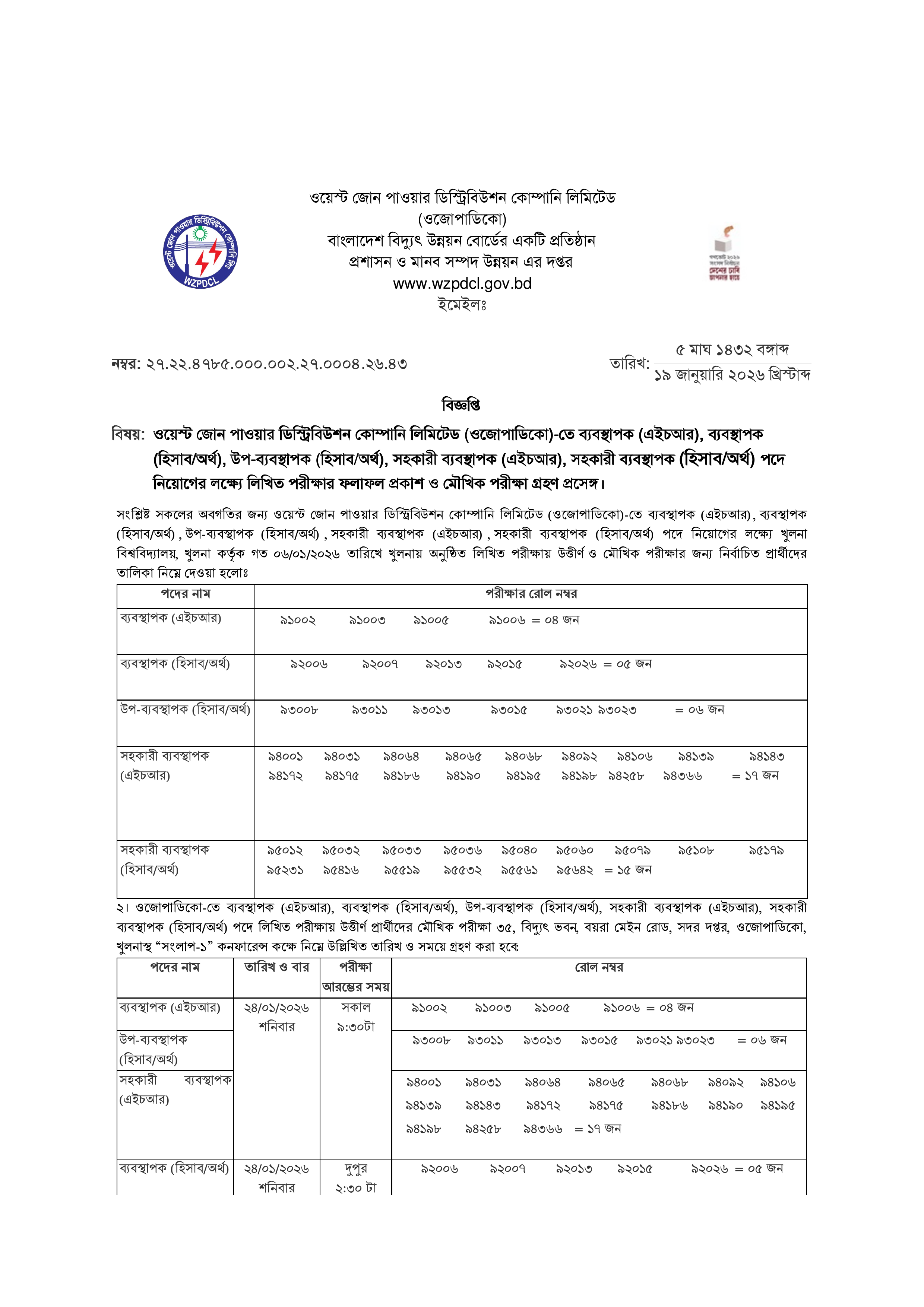 ওয়েস্ট জোন পাওয়ার ডিস্ট্রিবিউশন কোম্পানি লিমিটেড (ওজোপাডিকো)-তে বিভিন্ন পদে জনবল নিয়োগের লক্ষ্যে অনুষ্ঠিত লিখিত পরীক্ষার ফলাফল প্রকাশ করা হয়েছে। লিখিত পরীক্ষায় উত্তীর্ণ প্রার্থীদের মৌখিক পরীক্ষা বা ইন্টারভিউয়ের সময়সূচিও একইসাথে ঘোষণা করা হয়েছে।