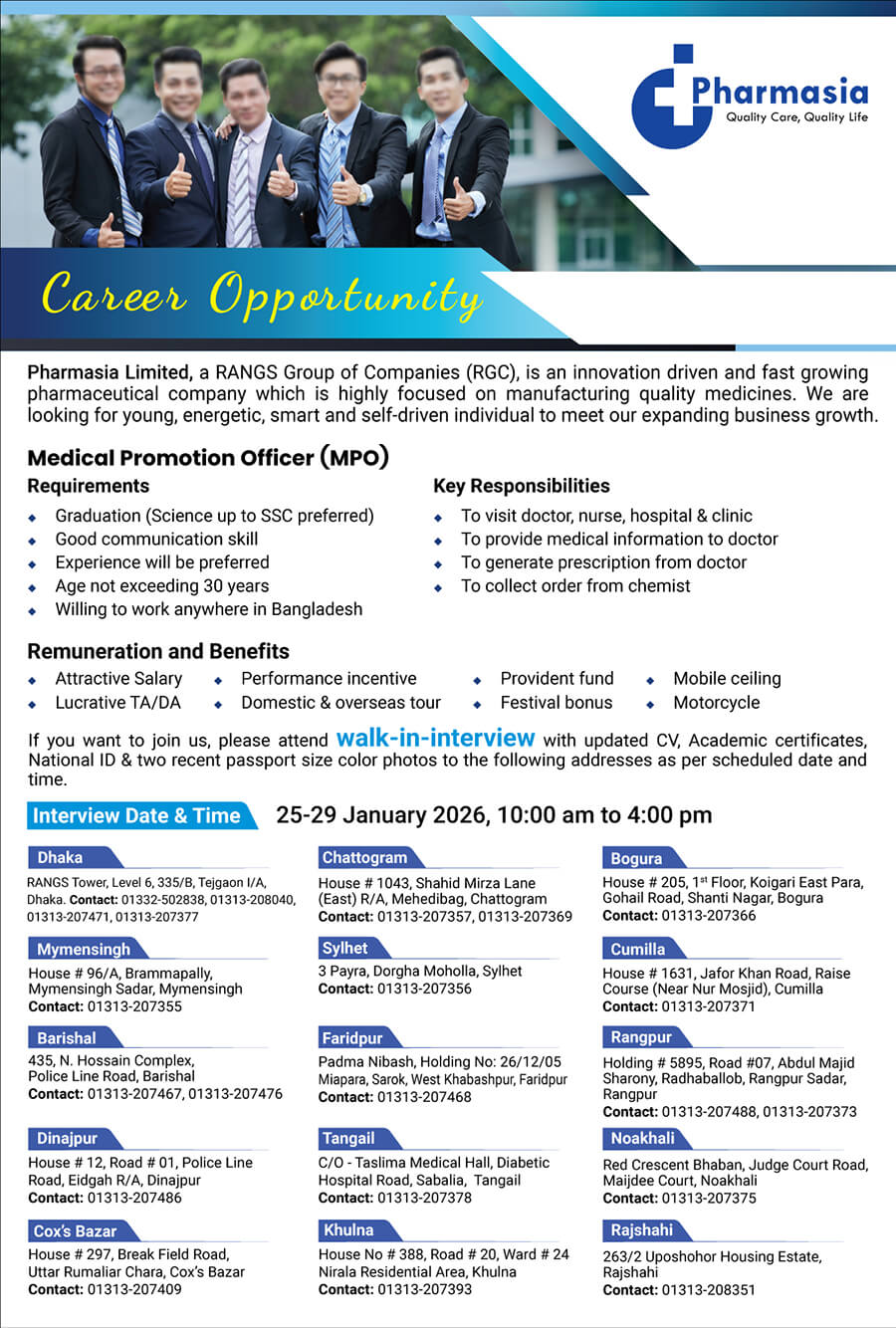 র্যাংগস গ্রুপ অফ কোম্পানিজের (RGC) অন্যতম অঙ্গপ্রতিষ্ঠান ফার্মাশিয়া লিমিটেড একটি দ্রুত বর্ধনশীল ওষুধ উৎপাদনকারী প্রতিষ্ঠান। ব্যবসার সম্প্রসারণের লক্ষ্যে প্রতিষ্ঠানটি দেশের যেকোনো প্রান্তে কাজ করতে আগ্রহী, উদ্যমী এবং পরিশ্রমী তরুণদের খুঁজছে।