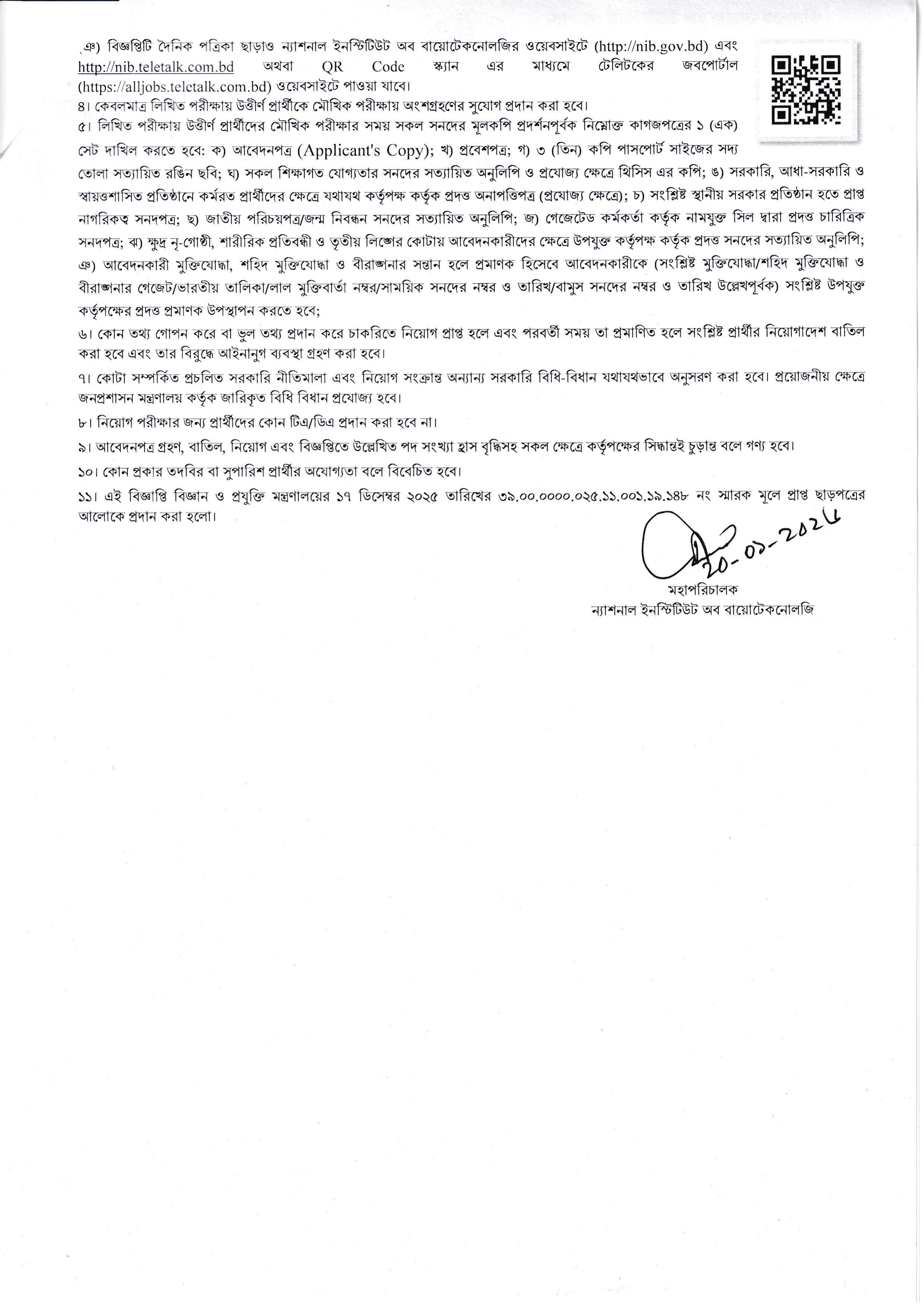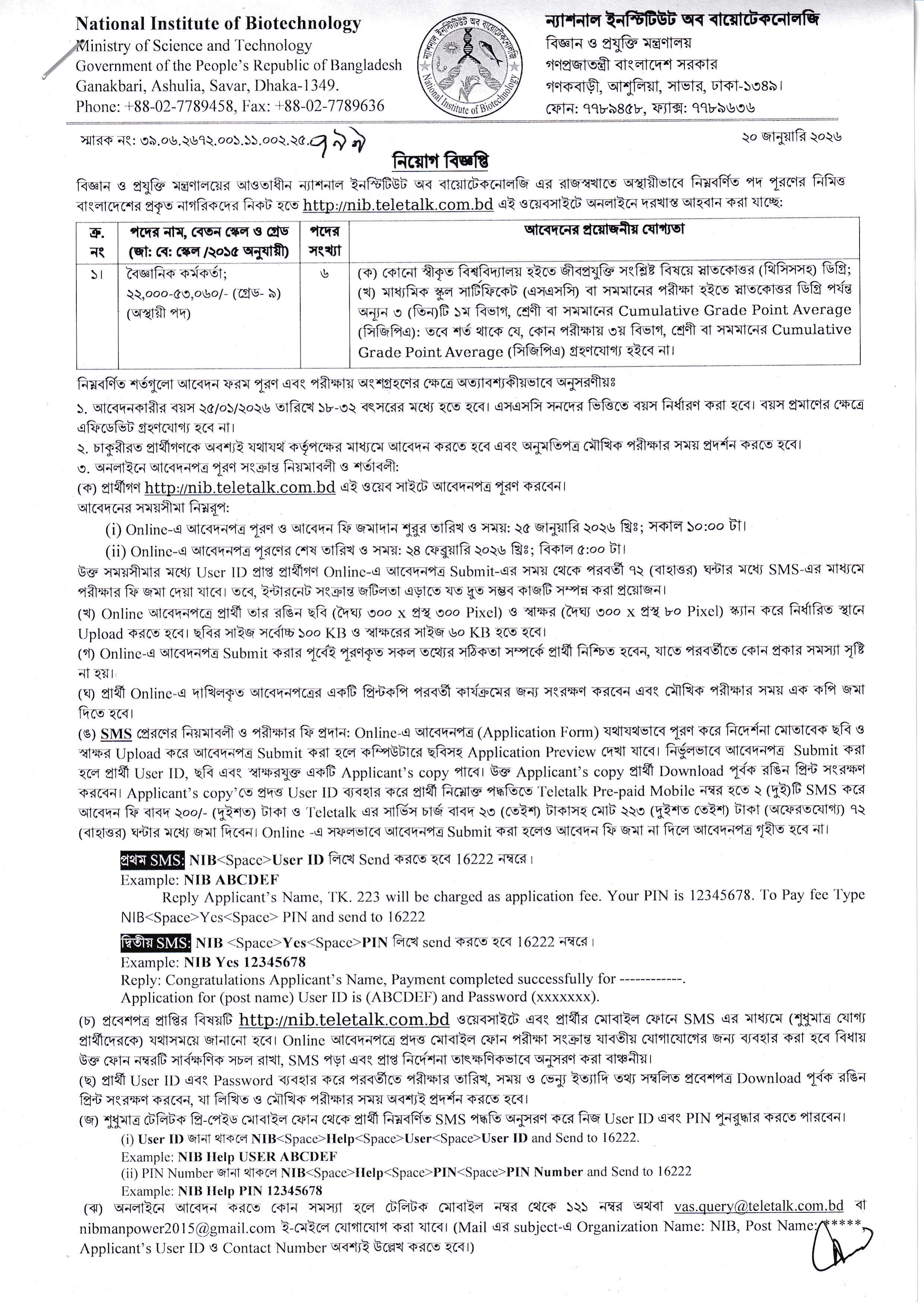 বিজ্ঞান ও প্রযুক্তি মন্ত্রণালয়ের আওতাধীন ন্যাশনাল ইনস্টিটিউট অব বায়োটেকনোলজি (NIB Job Circular)-তে রাজস্বখাতে অস্থায়ীভাবে জনবল নিয়োগের জন্য বিজ্ঞপ্তি প্রকাশ করা হয়েছে। আগ্রহী যোগ্য প্রার্থীরা অনলাইনে আবেদন করতে পারবেন।