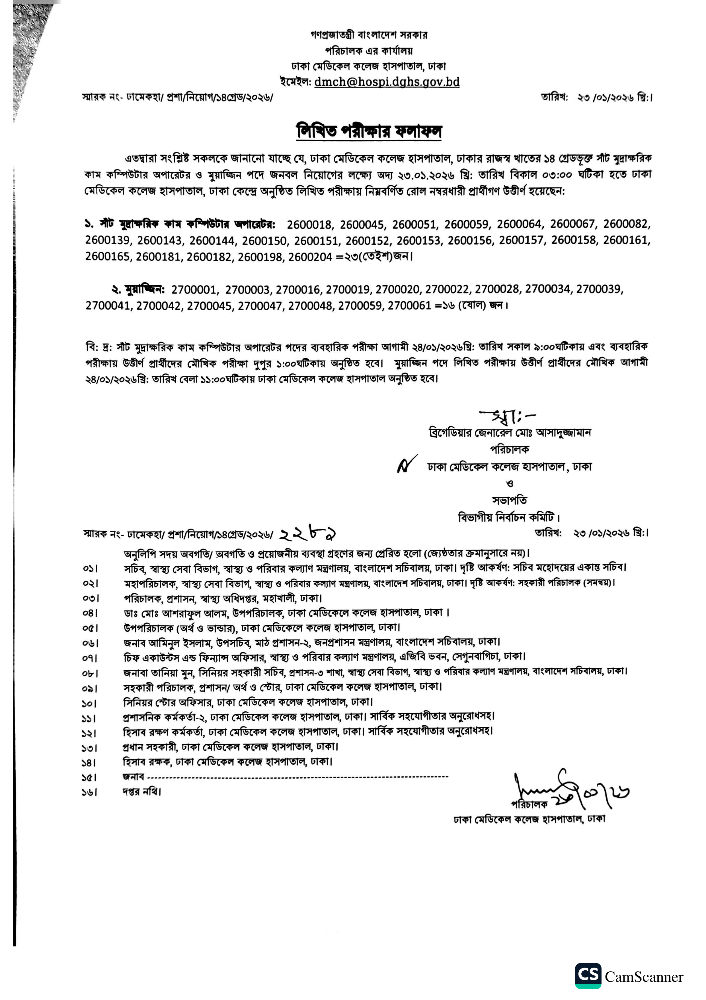 ঢাকা মেডিকেল কলেজ হাসপাতাল, ঢাকার রাজস্ব খাতের সীট মুদ্রাক্ষরিক কাম কম্পিউটার অপারেটর এবং মুয়াজ্জিন পদের জনবল নিয়োগের লক্ষ্যে অনুষ্ঠিত লিখিত পরীক্ষার ফলাফল প্রকাশ করা হয়েছে।