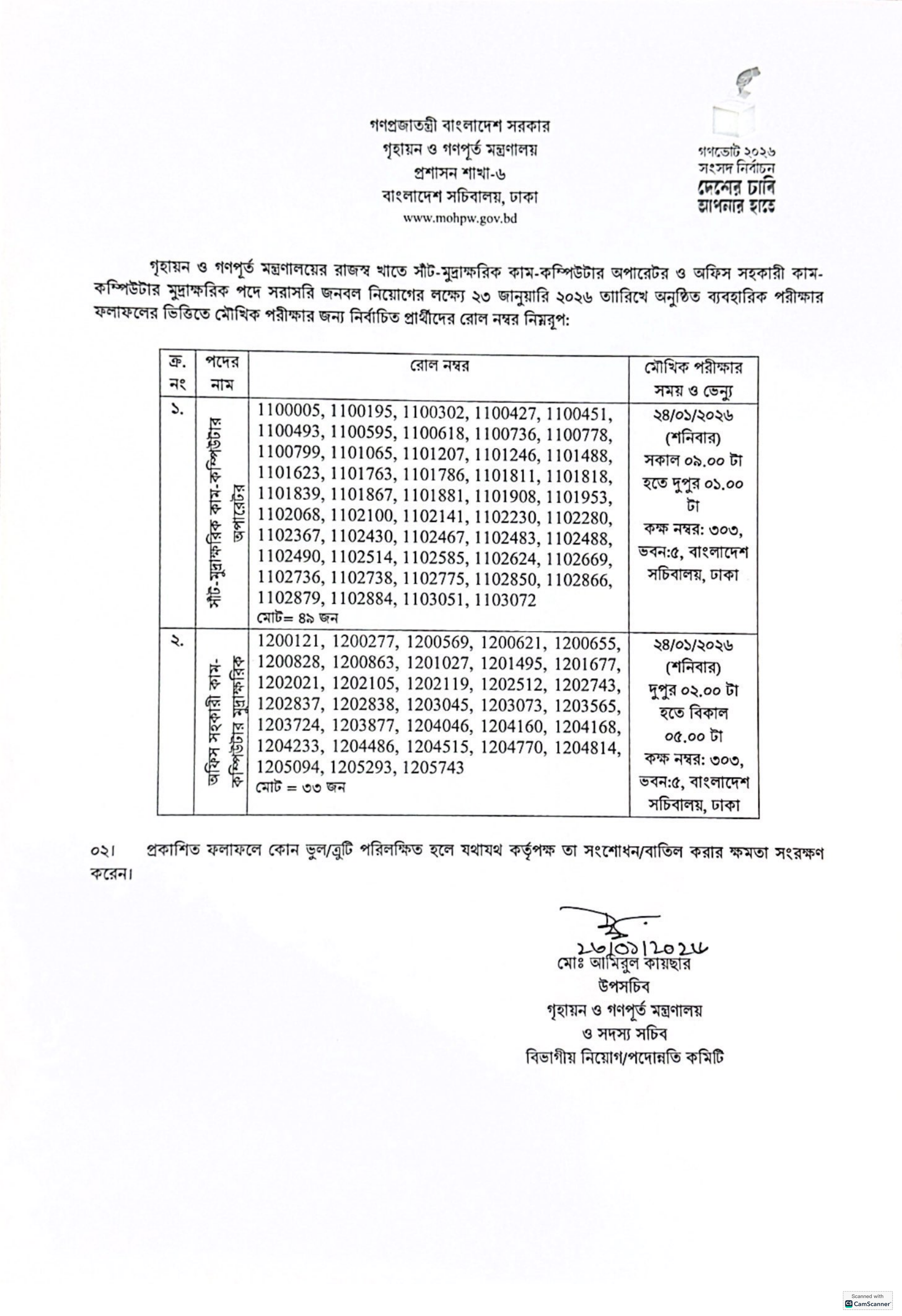 মৌখিক পরীক্ষা বাংলাদেশ সচিবালয়, ঢাকা -এ অনুষ্ঠিত হবে।