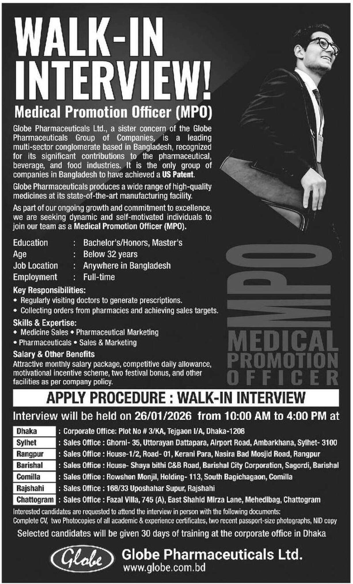 গ্লোব ফার্মাসিউটিক্যালস লিমিটেড (globe Job Circular 2026) তাদের মেডিকেল প্রমোশন অফিসার (MPO) পদের জন্য ডায়নামিক এবং পরিশ্রমী জনবল নিয়োগের উদ্দেশ্যে বিজ্ঞপ্তি প্রকাশ করেছে। আগ্রহী প্রার্থীদের সরাসরি সাক্ষাৎকারের (Walk-in Interview) মাধ্যমে নিয়োগ দেওয়া হবে।