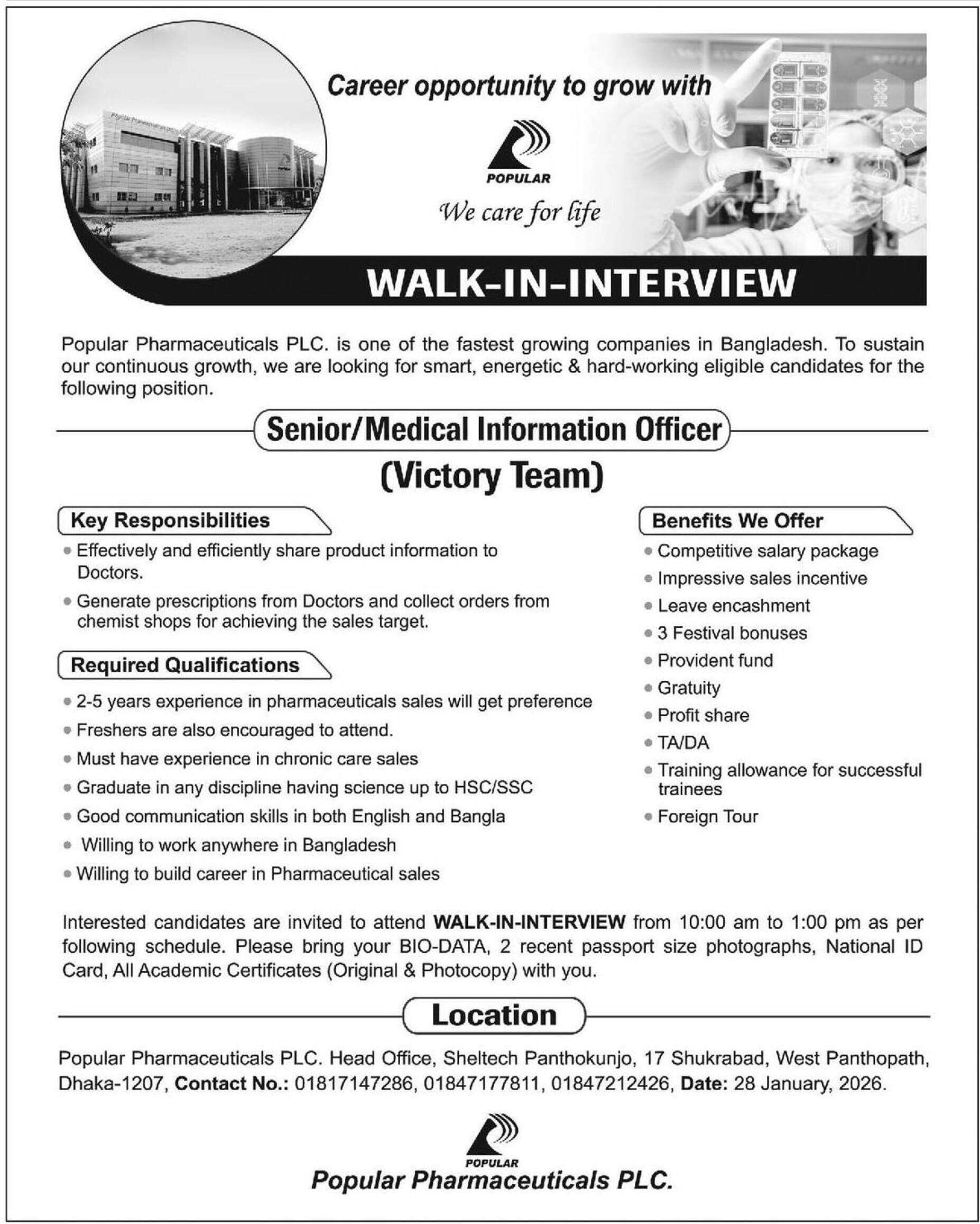 বাংলাদেশের অন্যতম দ্রুত বর্ধনশীল ওষুধ প্রস্তুতকারী প্রতিষ্ঠান ‘পপুলার ফার্মাসিউটিক্যালস পিএলসি’ তাদের ভিক্টরি টিমের (Victory Team) জন্য জনবল নিয়োগের বিজ্ঞপ্তি প্রকাশ করেছে। আগ্রহী এবং যোগ্য প্রার্থীদের সরাসরি ইন্টারভিউ বা ওয়াক-ইন-ইন্টারভিউ (Walk-in-Interview)-এ অংশগ্রহণের জন্য আহ্বান জানানো হয়েছে।