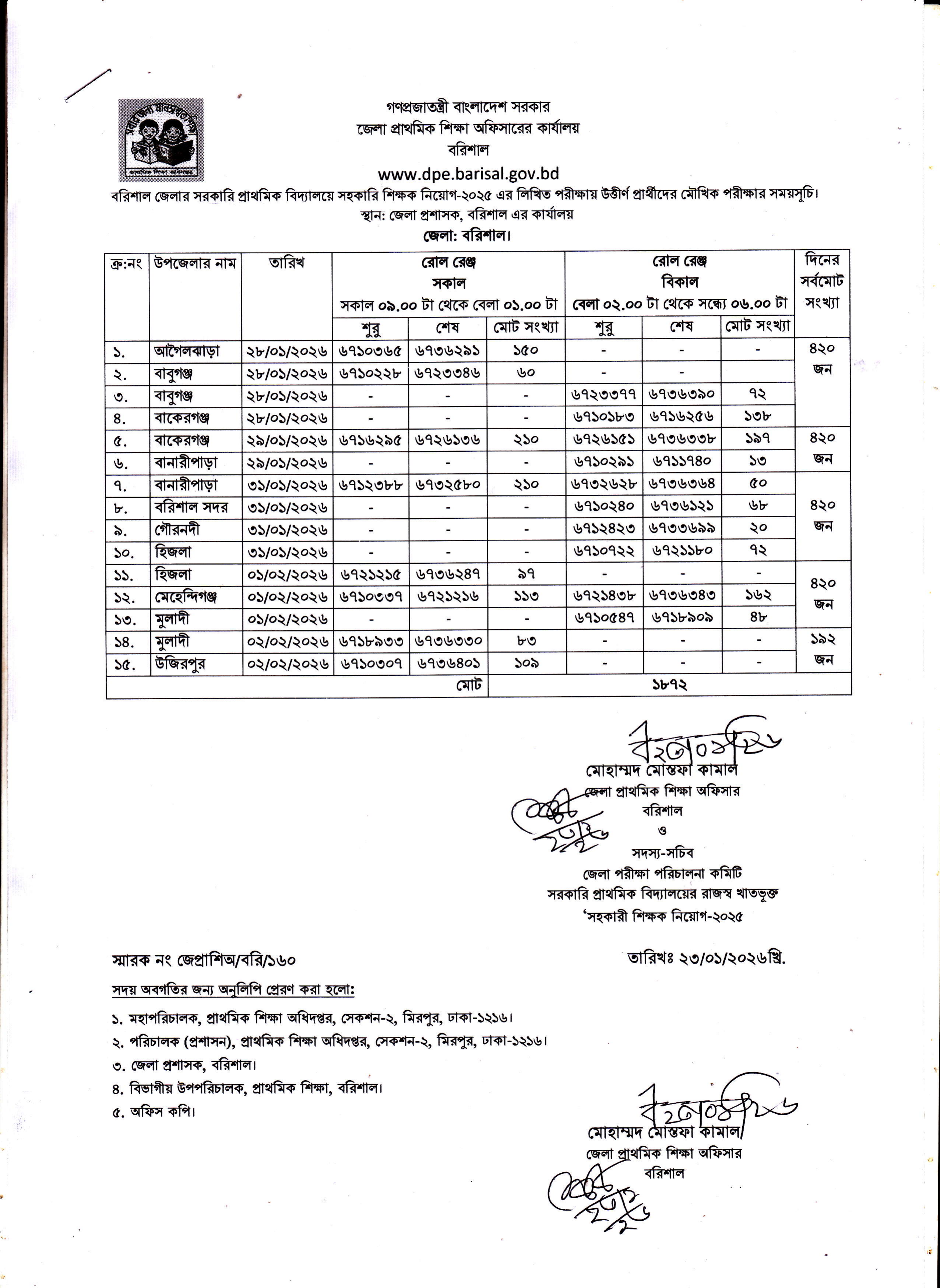 প্রকাশিত সময়সূচি অনুযায়ী, বরিশাল জেলার সরকারি প্রাথমিক বিদ্যালয়ে সহকারি শিক্ষক পদের মৌখিক পরীক্ষা জেলা প্রশাসক, বরিশাল এর কার্যালয়ে অনুষ্ঠিত হবে।