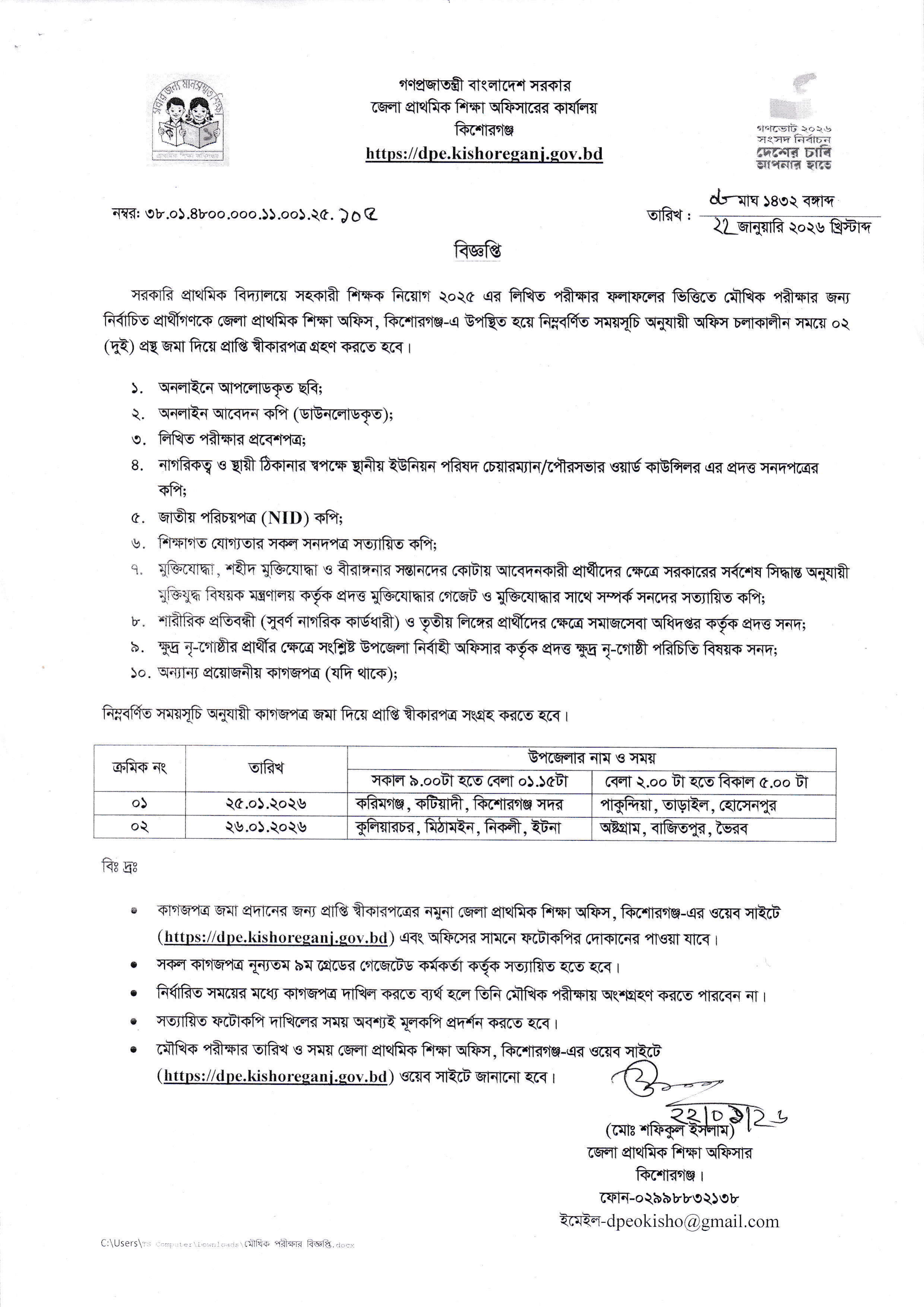 • মৌখিক পরীক্ষার তারিখ ও সময় জেলা প্রাথমিক শিক্ষা অফিস, কিশোরগঞ্জ-এর ওয়েবসাইটে (https://dpe.kishoreganj.gov.bd) জানানো হবে।