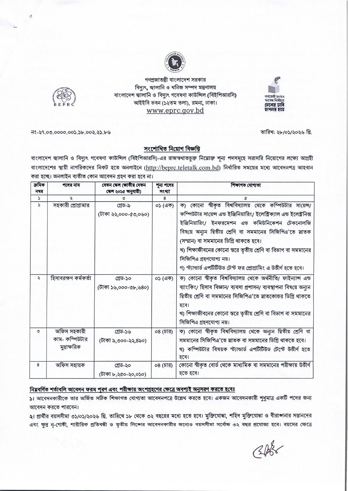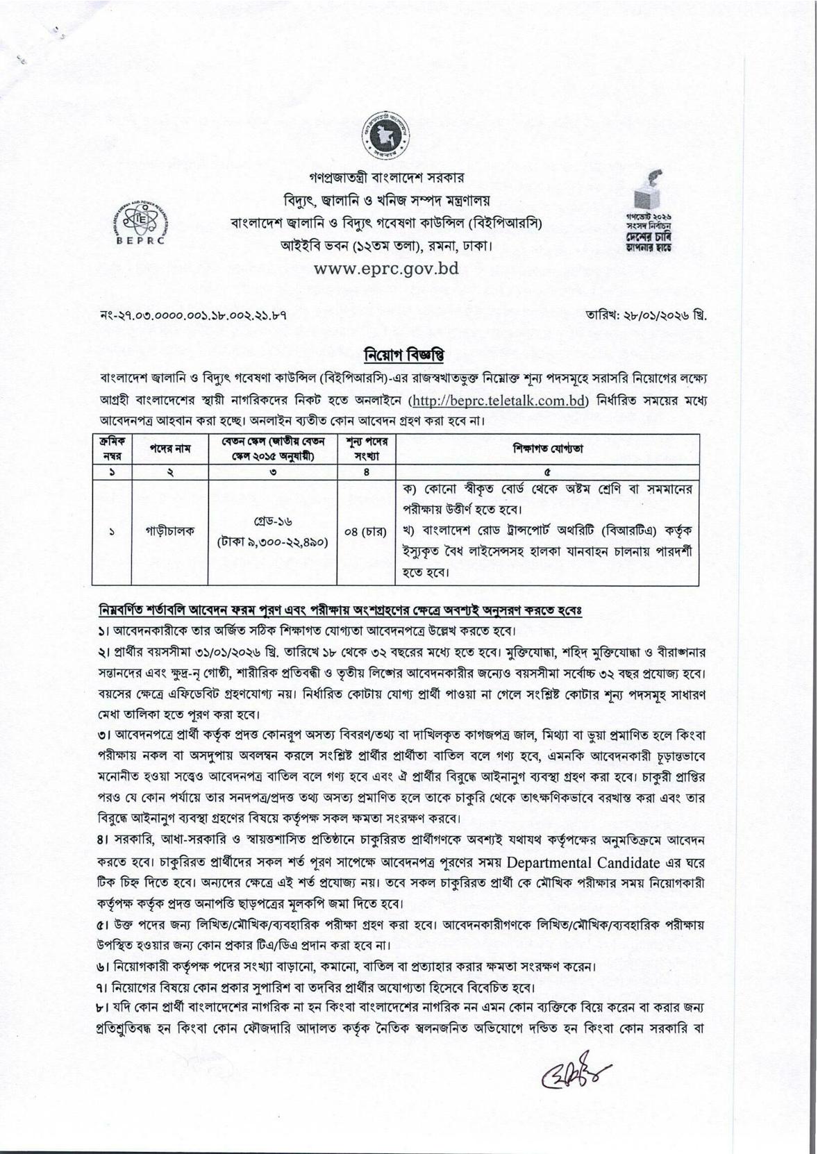 বিইপিআরসি (BEPRC) সম্প্রতি বিভিন্ন পদে জনবল নিয়োগের জন্য একটি বিজ্ঞপ্তি প্রকাশ করেছে। আগ্রহী ও যোগ্য প্রার্থীরা এই নিয়োগ বিজ্ঞপ্তির জন্য আবেদন করতে পারবেন।