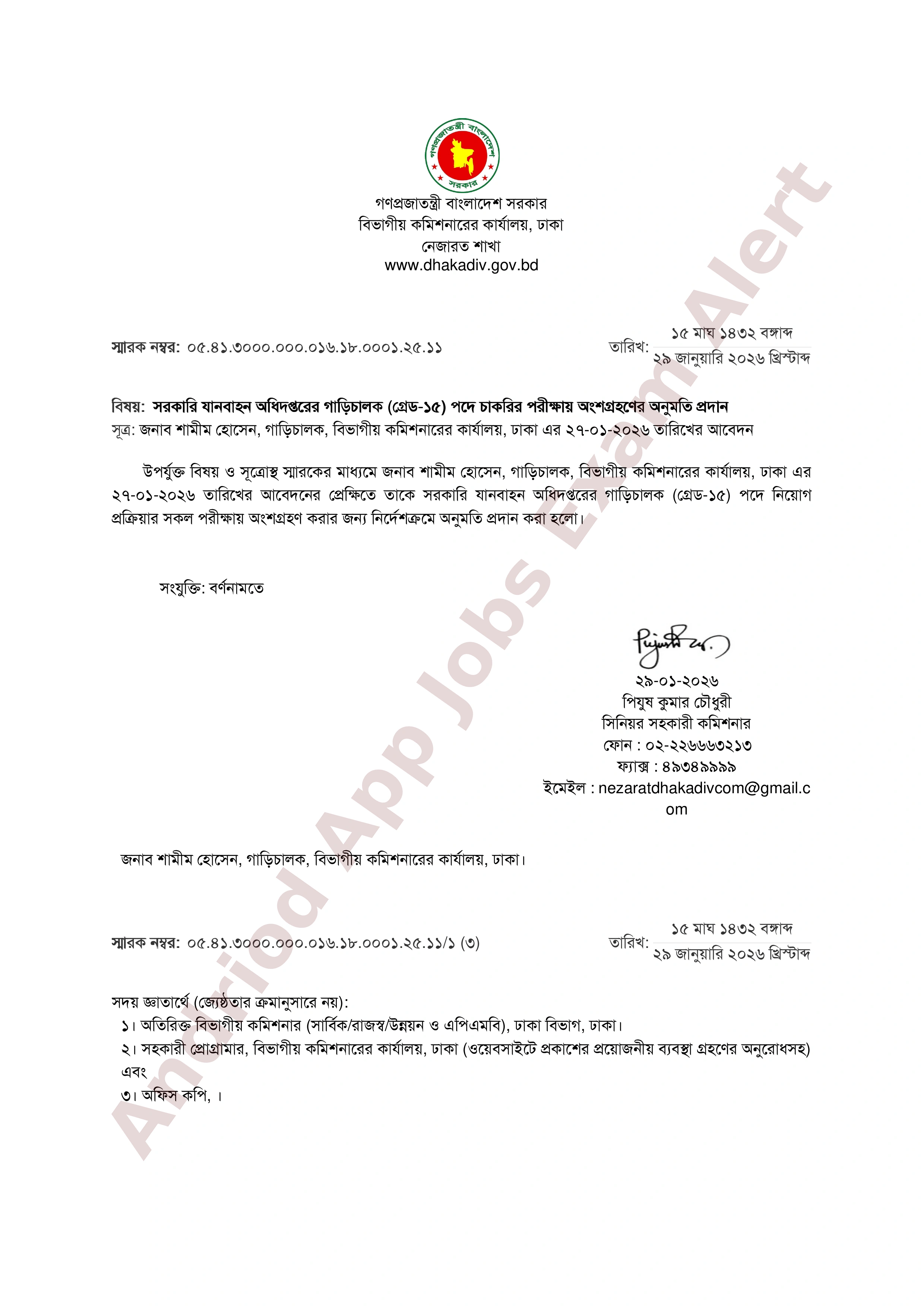 গুরুত্বপূর্ণ তথ্য: বিভাগীয় কমিশনারের কার্যালয়, ঢাকা-এ কর্মরত গাড়িচালক জনাব শামীম হোসেনকে সরকারি যানবাহন অধিদপ্তরের গাড়িচালক পদে নিয়োগ প্রক্রিয়ার সকল পরীক্ষায় অংশগ্রহণের জন্য নির্দেশক্রমে অনুমতি প্রদান করা হয়েছে।