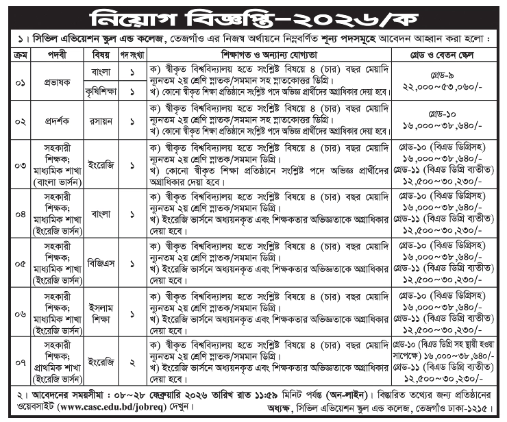 সিভিল এভিয়েশন স্কুল এন্ড কলেজ, তেজগাঁও-এর নিজস্ব অর্থায়নে নিম্নবর্ণিত শূন্য পদসমূহে জনবল নিয়োগের জন্য যোগ্য প্রার্থীদের কাছ থেকে আবেদন আহ্বান করা যাচ্ছে। আগ্রহী প্রার্থীরা অনলাইনে নির্ধারিত সময়ের মধ্যে আবেদন করতে পারবেন।