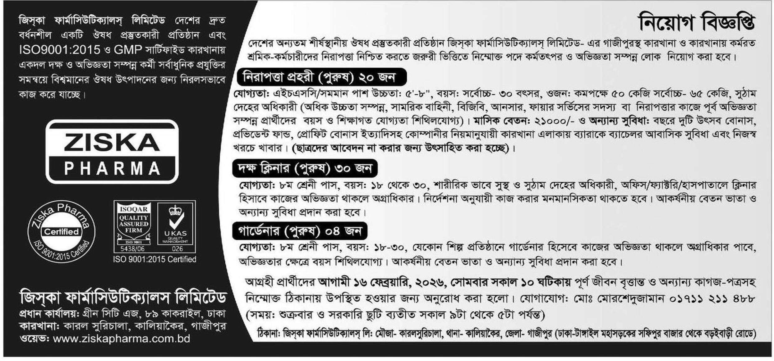 জিস্কা ফার্মাসিউটিক্যালস্ লিমিটেড জরুরি ভিত্তিতে নিরাপত্তা প্রহরী, ক্লিনার এবং গার্ডেনার পদে জনবল নিয়োগের বিজ্ঞপ্তি প্রকাশ করেছে। মাসিক বেতন ২১,০০০ টাকা পর্যন্ত। সরাসরি সাক্ষাতকারের তারিখ ১৬ ফেব্রুয়ারি, ২০২৬। বিস্তারিত দেখুন।