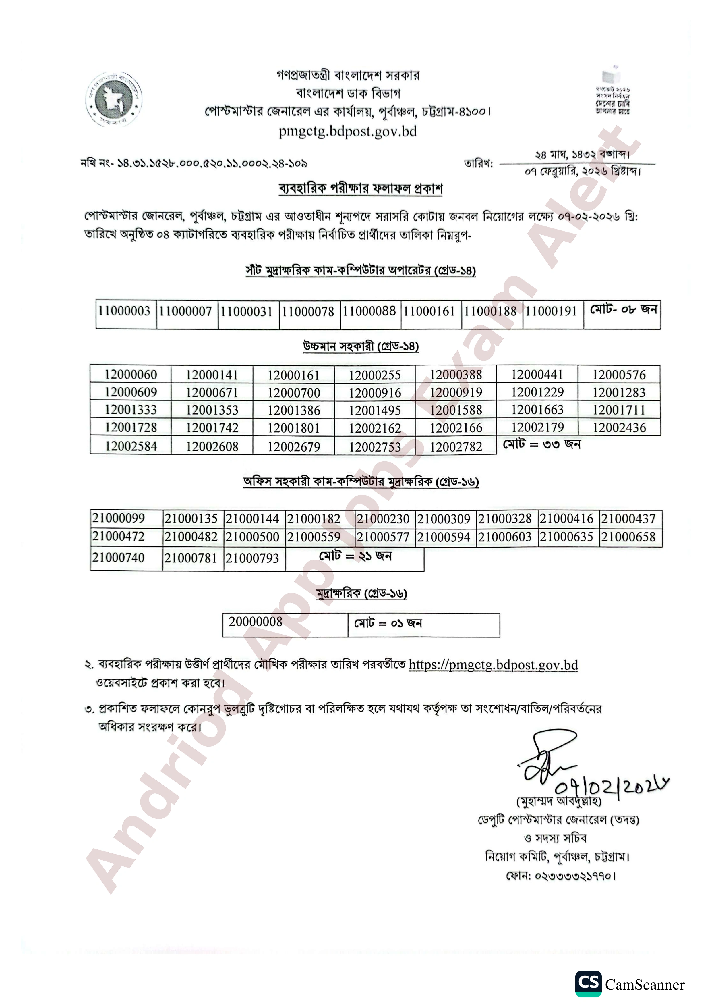 বাংলাদেশ ডাক বিভাগের পোস্টমাস্টার জেনারেলের কার্যালয়, পূর্বাঞ্চল, চট্টগ্রামের আওতাধীন বিভিন্ন শূন্যপদে জনবল নিয়োগের লক্ষ্যে অনুষ্ঠিত ব্যবহারিক পরীক্ষার ফলাফল প্রকাশিত হয়েছে। গত ০৭ ফেব্রুয়ারি ২০২৬ তারিখে অনুষ্ঠিত ০৪টি ক্যাটাগরির ব্যবহারিক পরীক্ষার ভিত্তিতে প্রার্থীদের প্রাথমিকভাবে নির্বাচন করা হয়েছে।