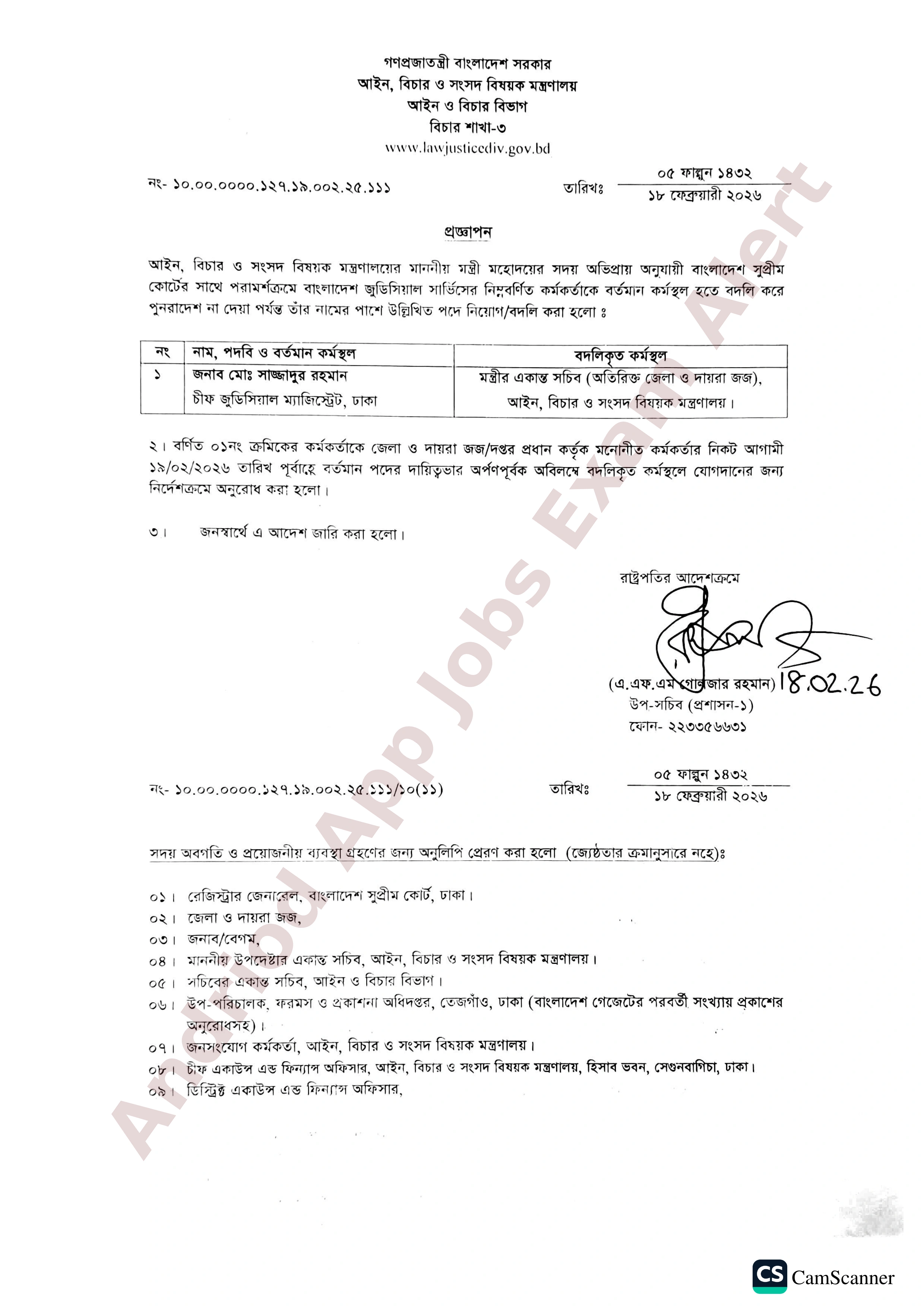আইন, বিচার ও সংসদ বিষয়ক মন্ত্রণালয়ের বিচার শাখা-৩ থেকে বাংলাদেশ জুডিসিয়াল সার্ভিসের একজন কর্মকর্তাকে বর্তমান কর্মস্থল হতে বদলি করে নতুন কর্মস্থলে নিয়োগ প্রদান করা হয়েছে। বাংলাদেশ সুপ্রীম কোর্টের সাথে পরামর্শক্রমে এই প্রজ্ঞাপন জারি করা হয়েছে।