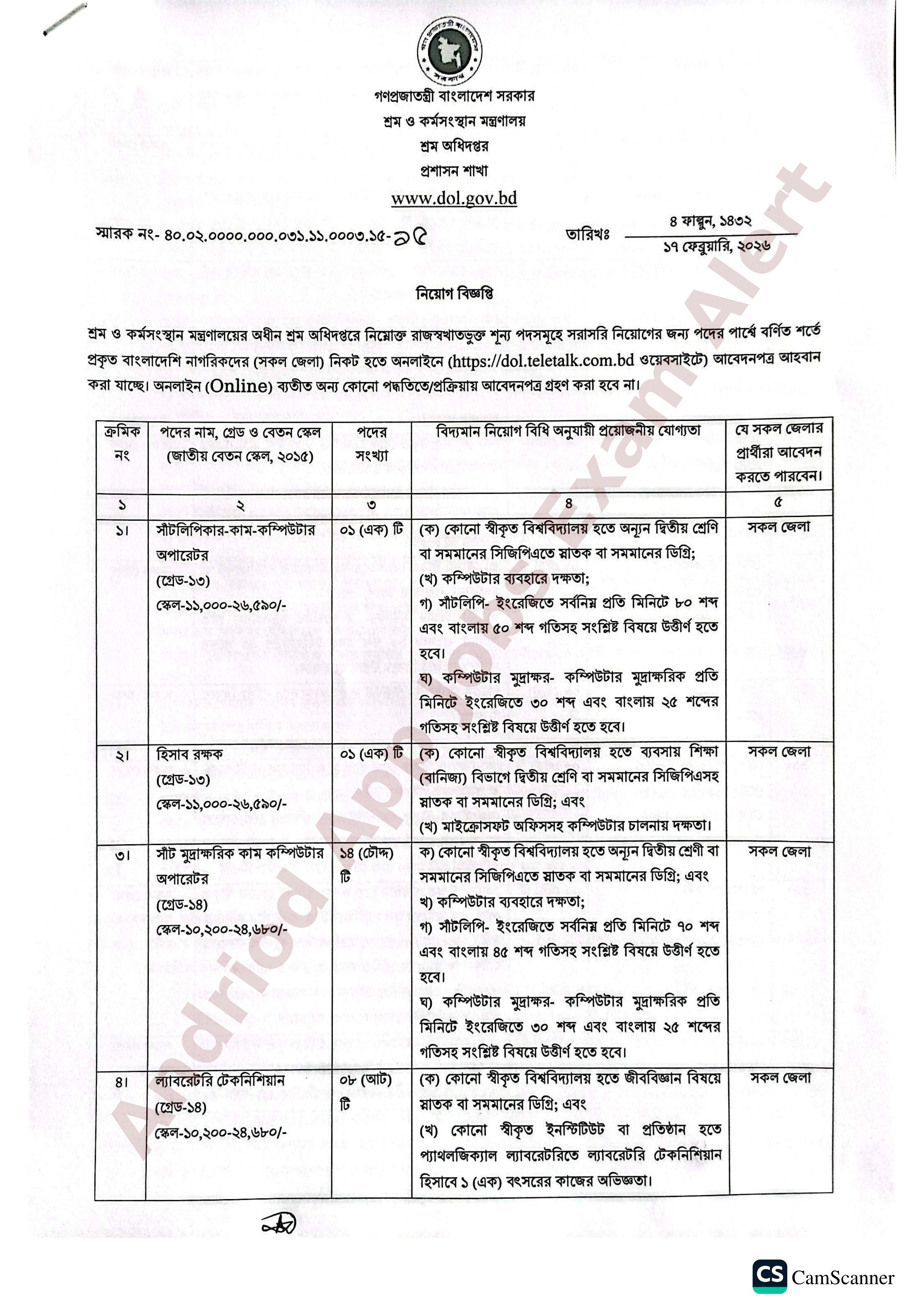 শ্রম ও কর্মসংস্থান মন্ত্রণালয়ের অধীন শ্রম অধিদপ্তর তাদের রাজস্বখাতভুক্ত বিভিন্ন শূন্য পদে সরাসরি জনবল নিয়োগের জন্য বিজ্ঞপ্তি প্রকাশ করেছে। আগ্রহী যোগ্য প্রার্থীদের নির্ধারিত সময়ের মধ্যে অনলাইনে আবেদন করার আহ্বান জানানো হচ্ছে।