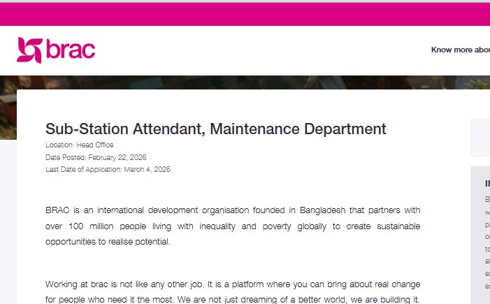 ব্র্যাক (BRAC) বিশ্বের অন্যতম বৃহত্তম আন্তর্জাতিক উন্নয়ন সংস্থা, যা বিশ্বজুড়ে ১০ কোটিরও বেশি মানুষের জীবনমান উন্নয়নে এবং দারিদ্র্য বিমোচনে কাজ করে যাচ্ছে। আমরা এমন একজন উদ্যমী ও দক্ষ কর্মীর খুঁজছি যিনি আমাদের মেইনটেনেন্স বা রক্ষণাবেক্ষণ টিমে যোগ দিয়ে সাব-স্টেশন এবং জেনারেটর পরিষেবার সুষ্ঠু কার্যক্রম নিশ্চিত করবেন।