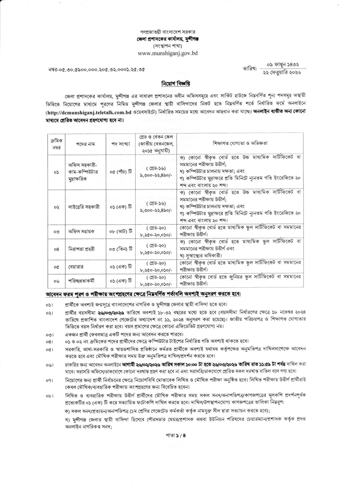 আবেদনের প্রক্রিয়া: আগ্রহী প্রার্থীদের অনলাইনে https://dcmunshiganj.teletalk.com.bd/ ওয়েবসাইটের মাধ্যমে নির্ধারিত আবেদন ফরম পূরণ করতে হবে।