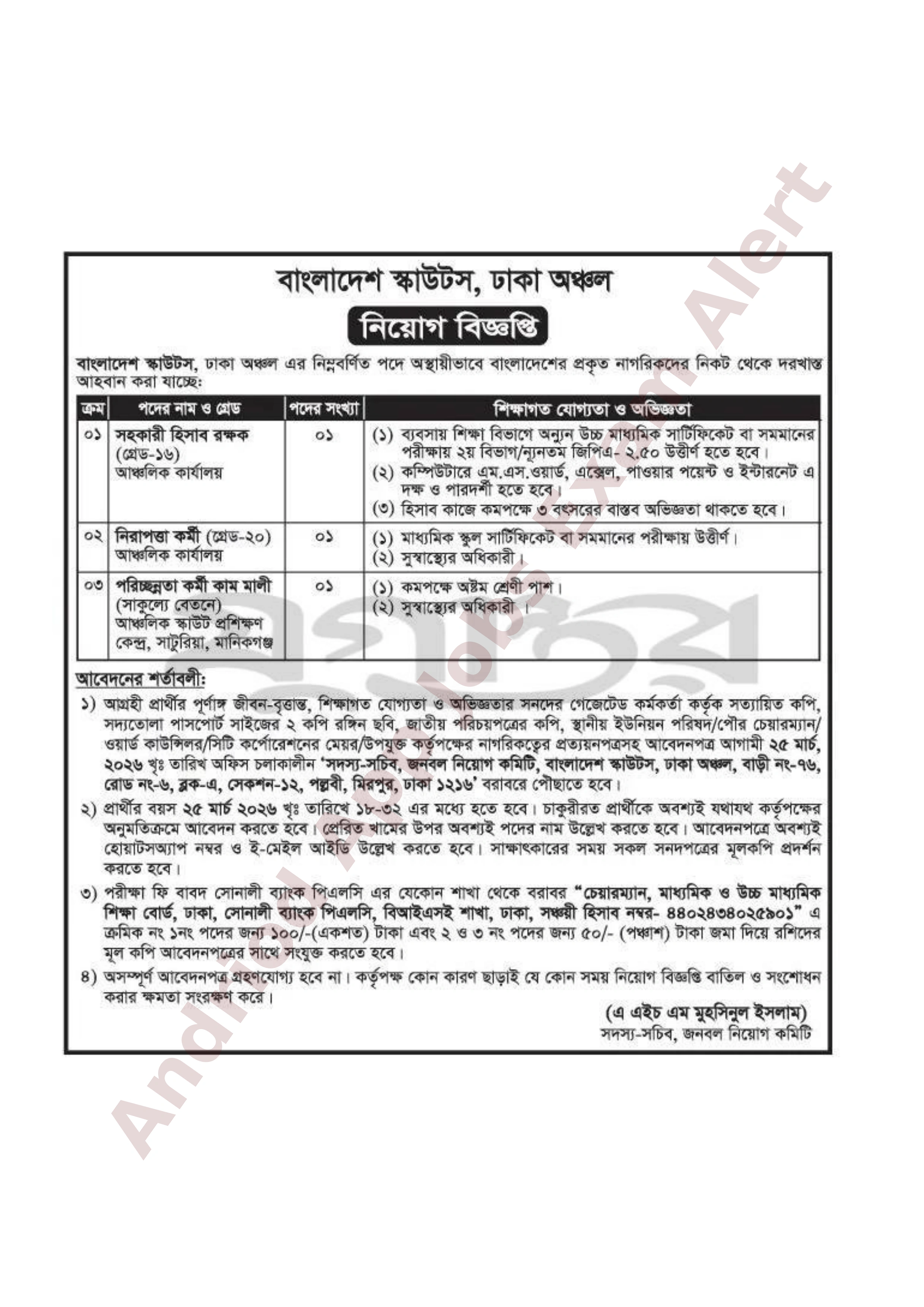আবেদন প্রক্রিয়া: আবেদনকারীকে নাগরিকত্বের প্রত্যয়নপত্রসহ আবেদনপত্র আগামী ২৫ মার্চ ২০২৬ তারিখ অফিস চলাকালীন সময়ের মধ্যে 'সদস্য-সচিব, জনবল নিয়োগ কমিটি, বাংলাদেশ স্কাউটস, ঢাকা অঞ্চল, বাড়ী নং-৭৬, রোড নং-৬, ব্লক-এ, সেকশন-১২, পল্লবী, মিরপুর, ঢাকা ১২১৬' বরাবর পৌঁছাতে হবে। আবেদনপত্রে অবশ্যই হোয়াটসঅ্যাপ নম্বর ও ই-মেইল আইডি উল্লেখ করতে হবে।