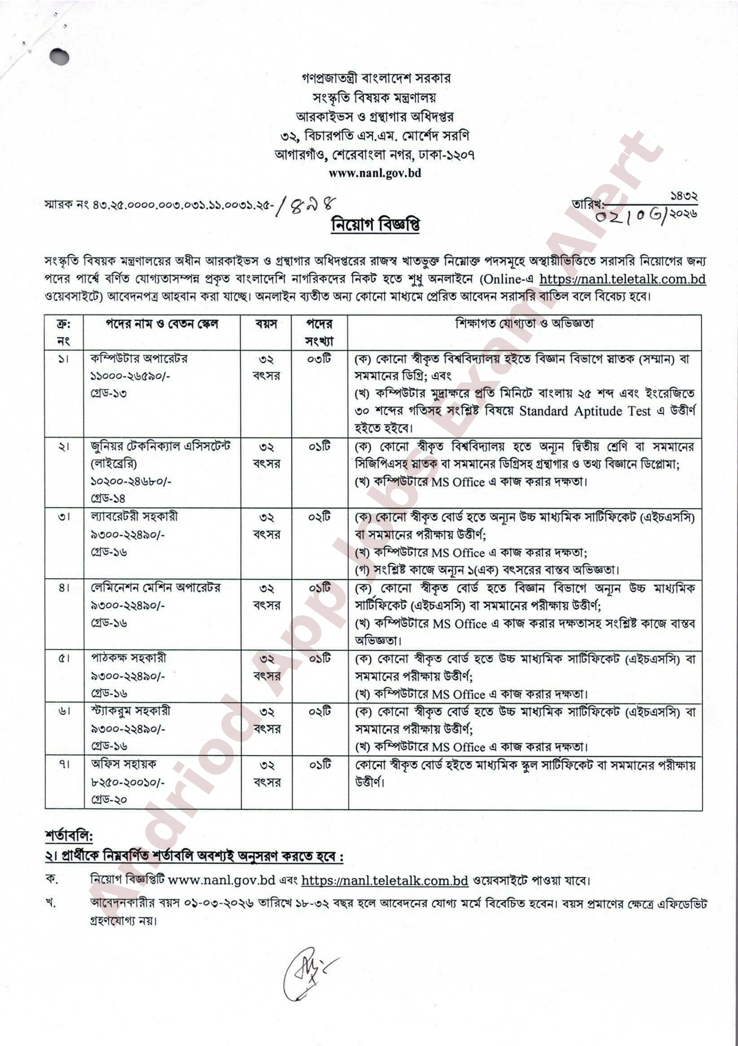 সংস্কৃতি বিষয়ক মন্ত্রণালয়ের অধীন আরকাইভস ও গ্রন্থাগার অধিদপ্তর রাজস্ব খাতভুক্ত একাধিক শূন্য পদে জনবল নিয়োগের জন্য বিজ্ঞপ্তি প্রকাশ করেছে। প্রতিষ্ঠানটি মোট ০৭টি ক্যাটাগরিতে ১১ জনকে স্থায়ী ও অস্থায়ী ভিত্তিতে নিয়োগ দেবে।