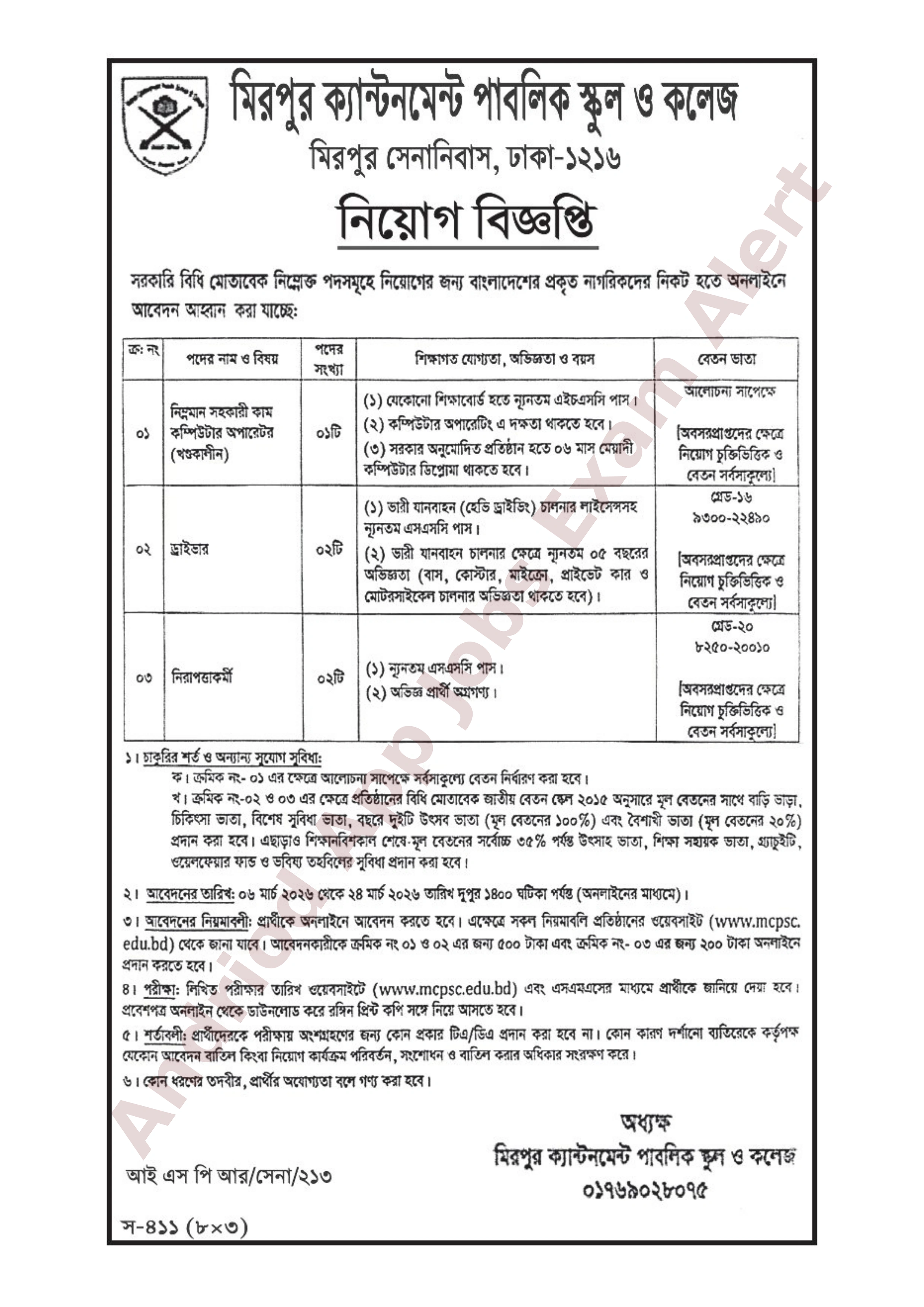 মিরপুর সেনানিবাসস্থ মিরপুর ক্যান্টনমেন্ট পাবলিক স্কুল ও কলেজ বিভিন্ন পদে জনবল নিয়োগের জন্য বিজ্ঞপ্তি প্রকাশ করেছে। আগ্রহী যোগ্য বাংলাদেশি নাগরিকদের নিকট হতে অনলাইনে আবেদন আহ্বান করা হয়েছে।