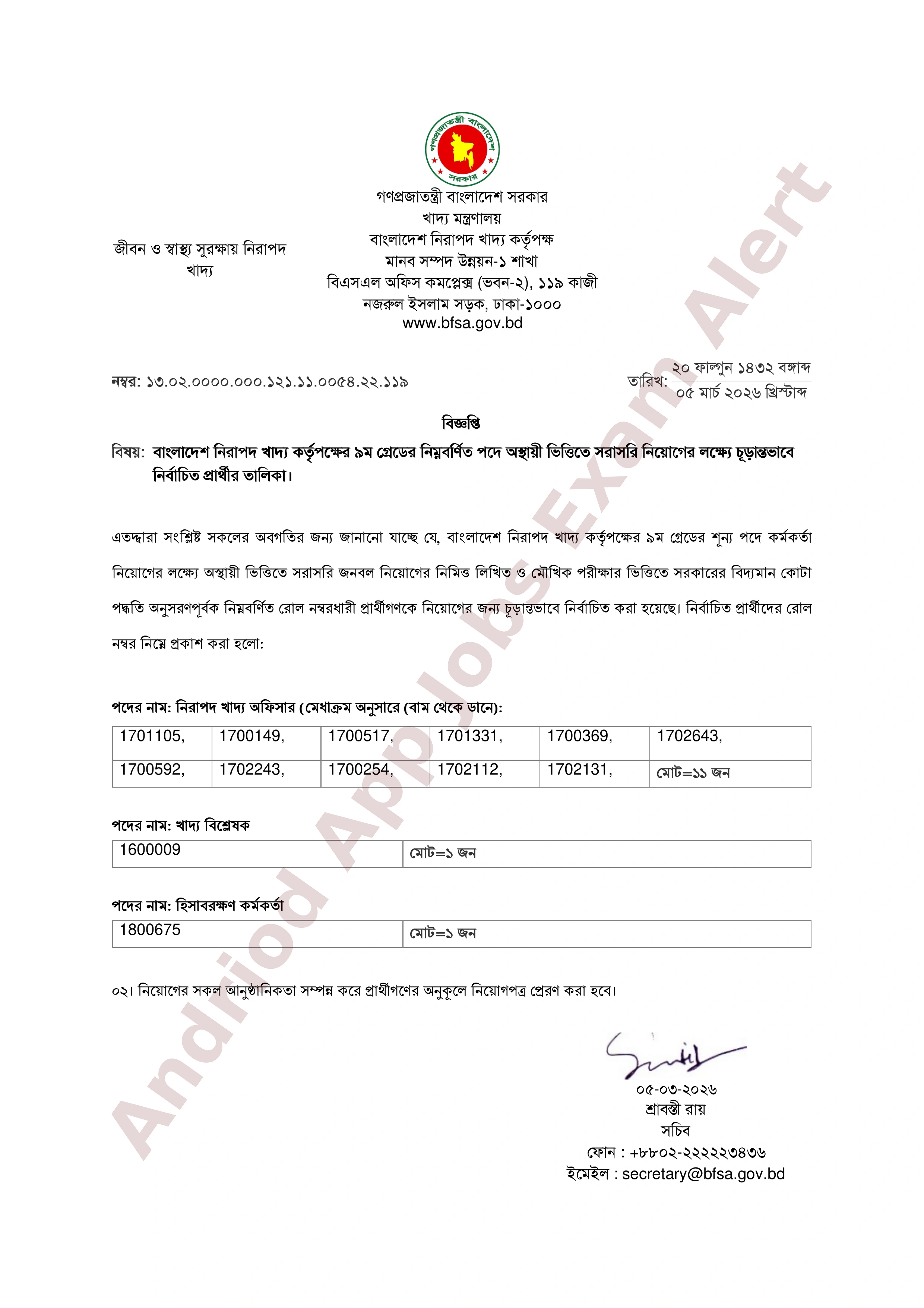বাংলাদেশ নিরাপদ খাদ্য কর্তৃপক্ষের ৯ম গ্রেডের চূড়ান্তভাবে নির্বাচিত প্রার্থীর তালিকা প্রকাশ