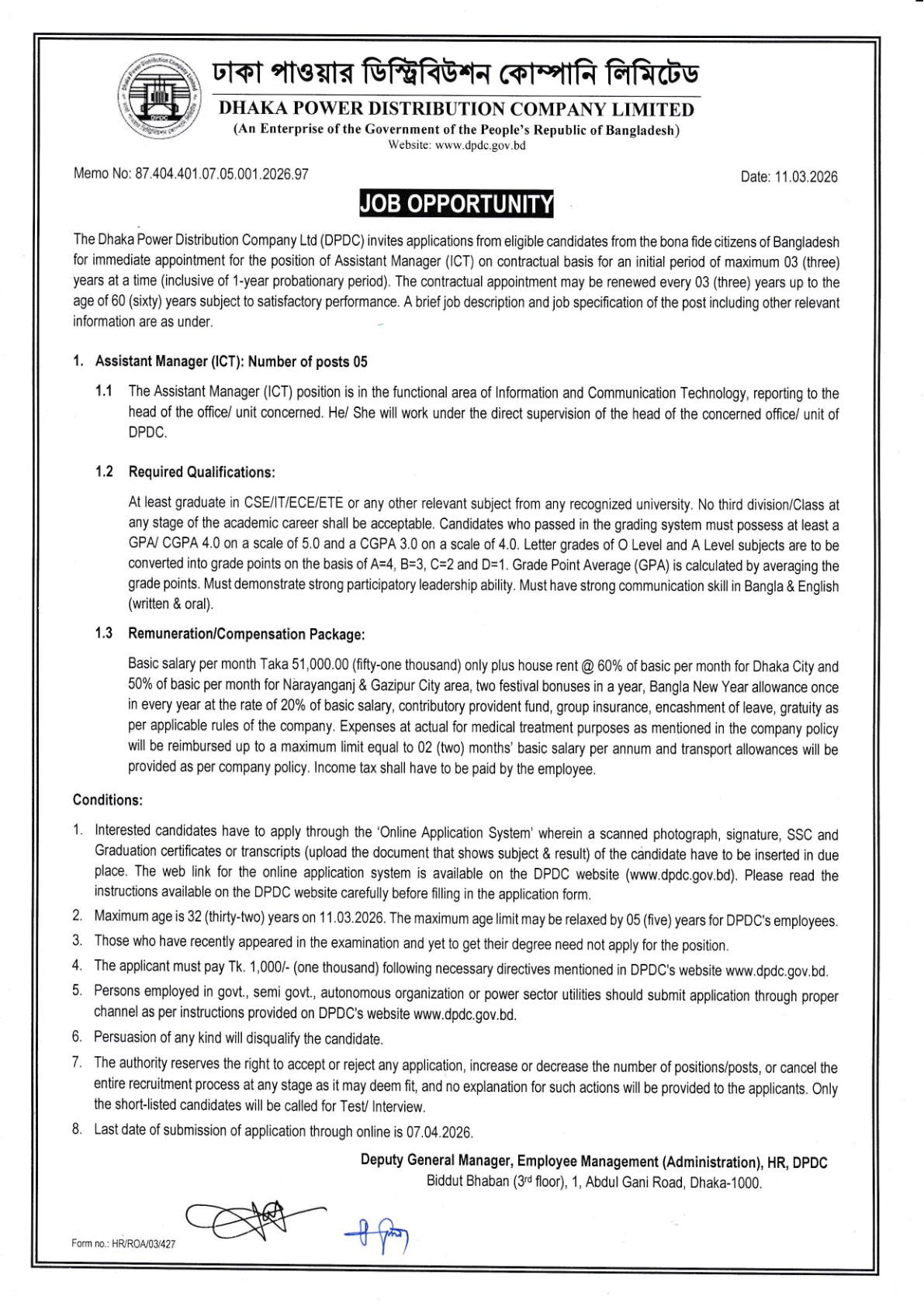 - আবেদন পদ্ধতি: আগ্রহী প্রার্থীদের ডিপিডিসির অফিসিয়াল ওয়েবসাইট www.dpdc.gov.bd এর মাধ্যমে অনলাইনে আবেদন করতে হবে।