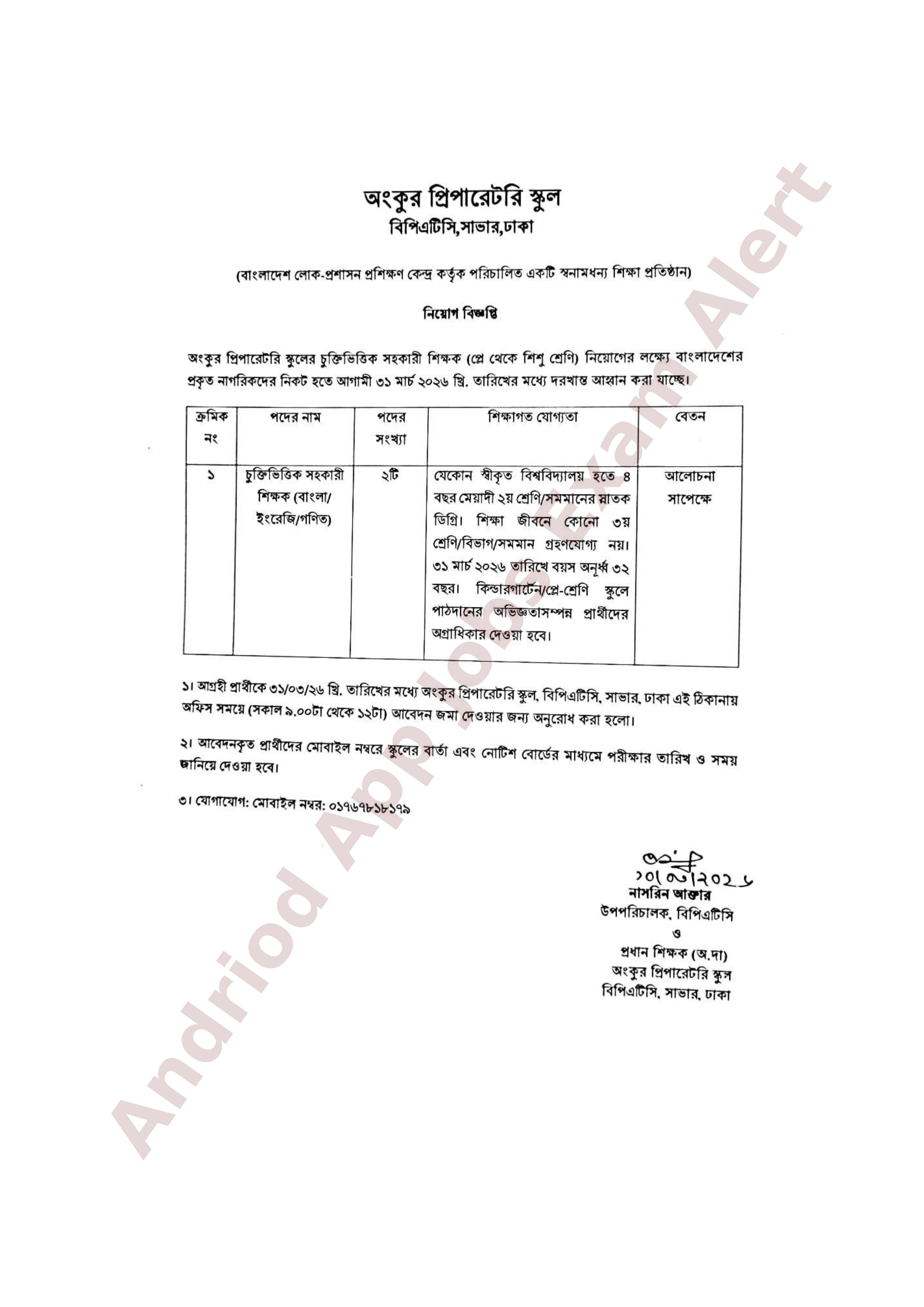 আবেদন প্রক্রিয়া: আগ্রহী প্রার্থীদের আগামী ৩১/০৩/২০২৬ তারিখের মধ্যে অফিস চলাকালীন সময়ে (সকাল ৯.০০টা থেকে দুপুর ১২.০০টা) সরাসরি অংকুর প্রিপারেটরি স্কুল, বিপিএটিসি, সাভার, ঢাকা এই ঠিকানায় আবেদনপত্র জমা দিতে হবে।