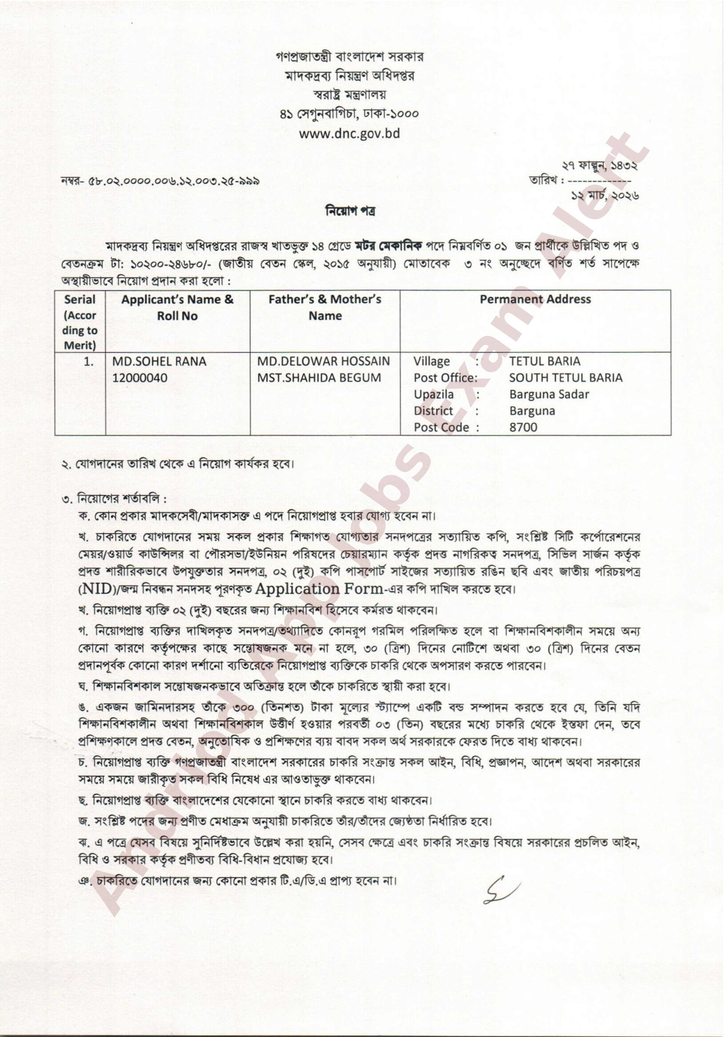 মাদকদ্রব্য নিয়ন্ত্রণ অধিদপ্তর তাদের রাজস্ব খাতভুক্ত মটর মেকানিক পদে ০১ জন প্রার্থীকে অস্থায়ীভাবে নিয়োগ প্রদান করেছে। নিয়োগপ্রাপ্ত প্রার্থীকে জাতীয় বেতন স্কেল, ২০১৫ অনুযায়ী টা: ১০২০০-২৪৬৮০/- (১৪ গ্রেড) বেতনক্রমে নিয়োগ দেওয়া হয়েছে।