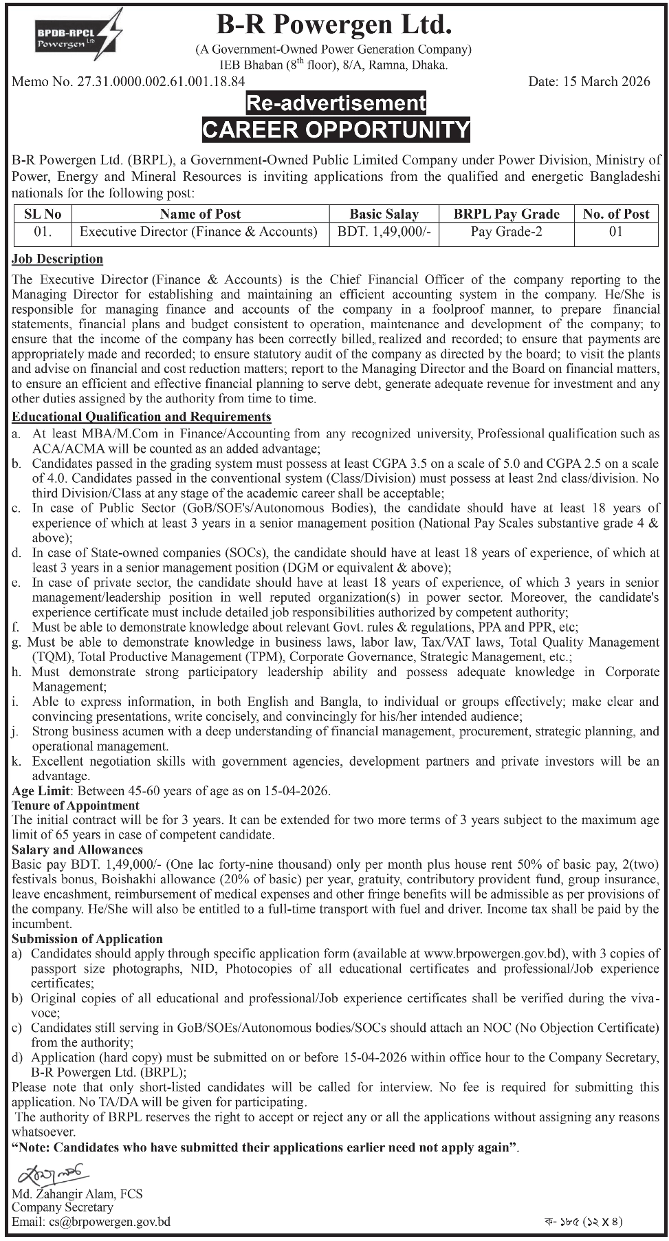 আবেদন পাঠানোর ঠিকানা:কোম্পানি সচিব, বি-আর পাওয়ারজেন লিঃ (BRPL), আইইবি ভবন (৯ম তলা), ৮/এ রমনা, ঢাকা।