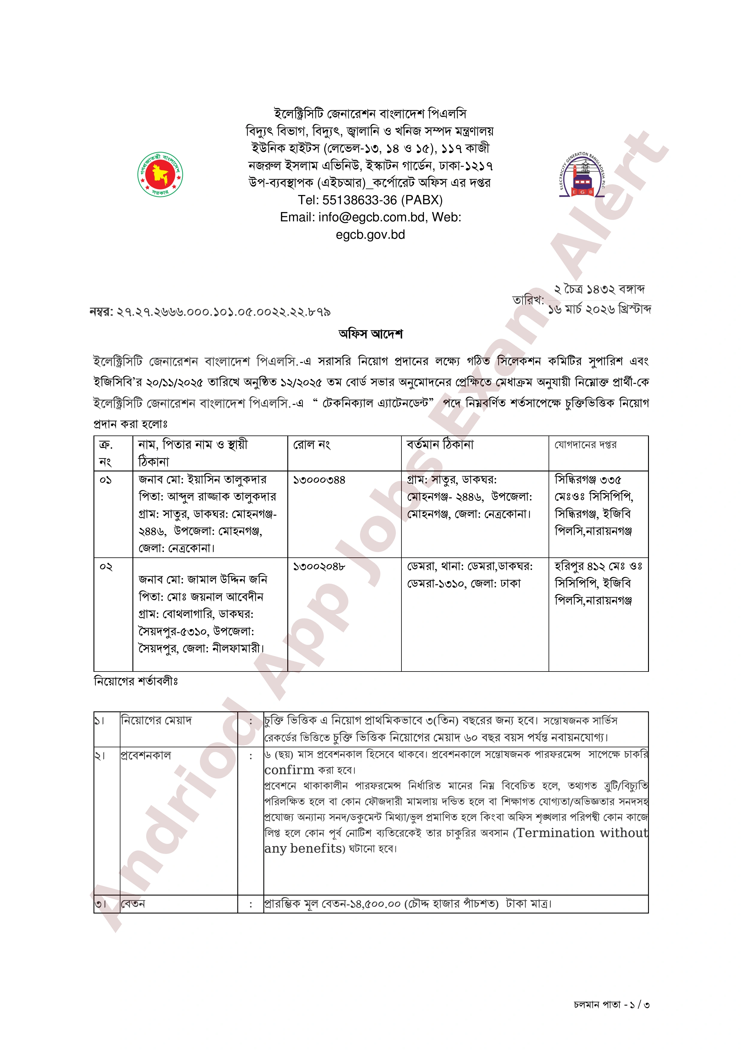 ইলেক্ট্রিসিটি জেনারেশন বাংলাদেশ পিএলসি (ইজিসিবি) সরাসরি জনবল নিয়োগের লক্ষ্যে চূড়ান্তভাবে নির্বাচিত প্রার্থীদের নিয়োগ প্রদান এবং যোগদানের অফিস আদেশ জারি করেছে।