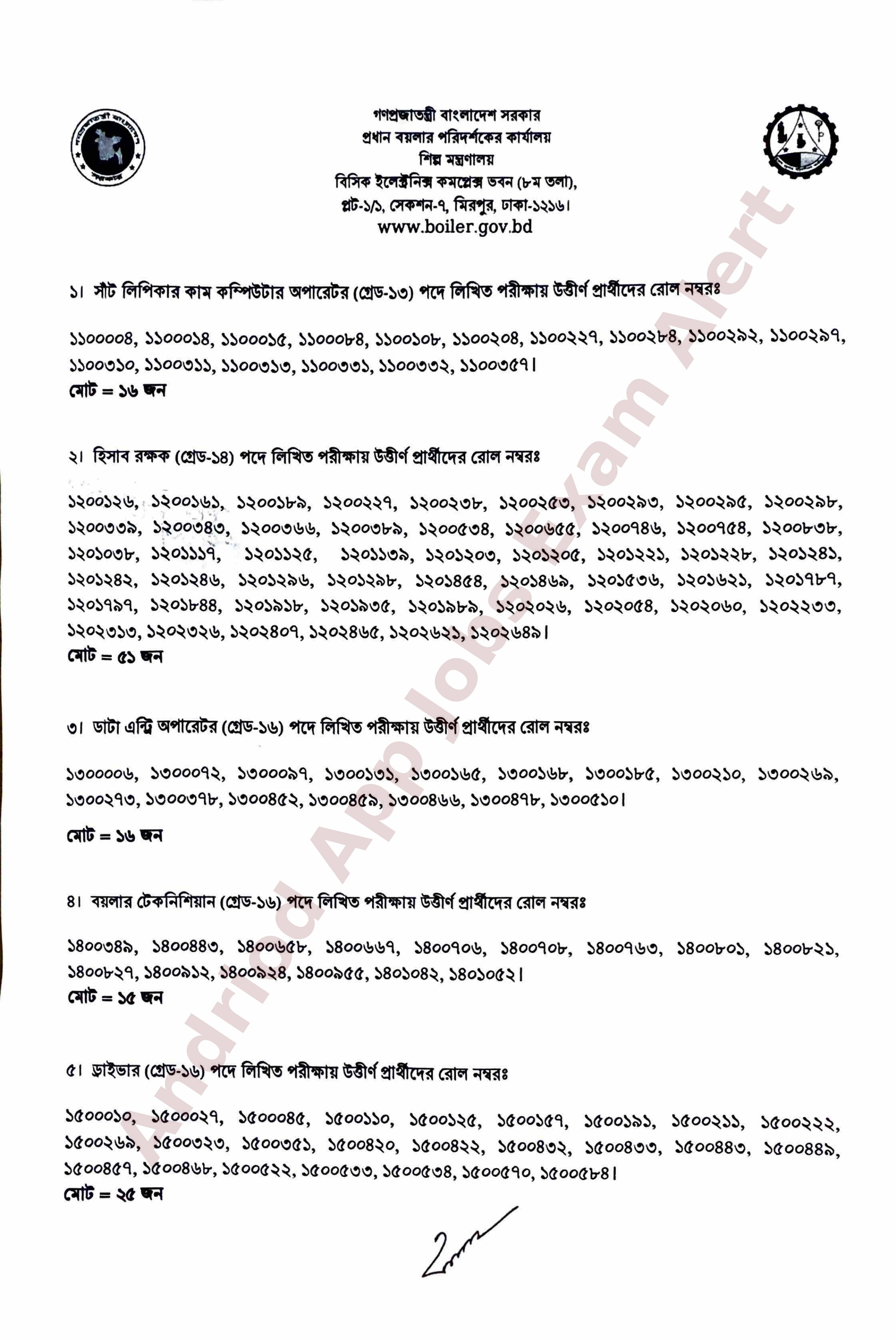 শিল্প মন্ত্রণালয়ের অধীন প্রধান বয়লার পরিদর্শকের কার্যালয়ের বিভিন্ন ক্যাটাগরির পদের লিখিত পরীক্ষার ফলাফল প্রকাশ করা হয়েছে। এতে উত্তীর্ণ প্রার্থীদের পরবর্তী ধাপের পরীক্ষার জন্য সাময়িকভাবে নির্বাচন করা হয়েছে।