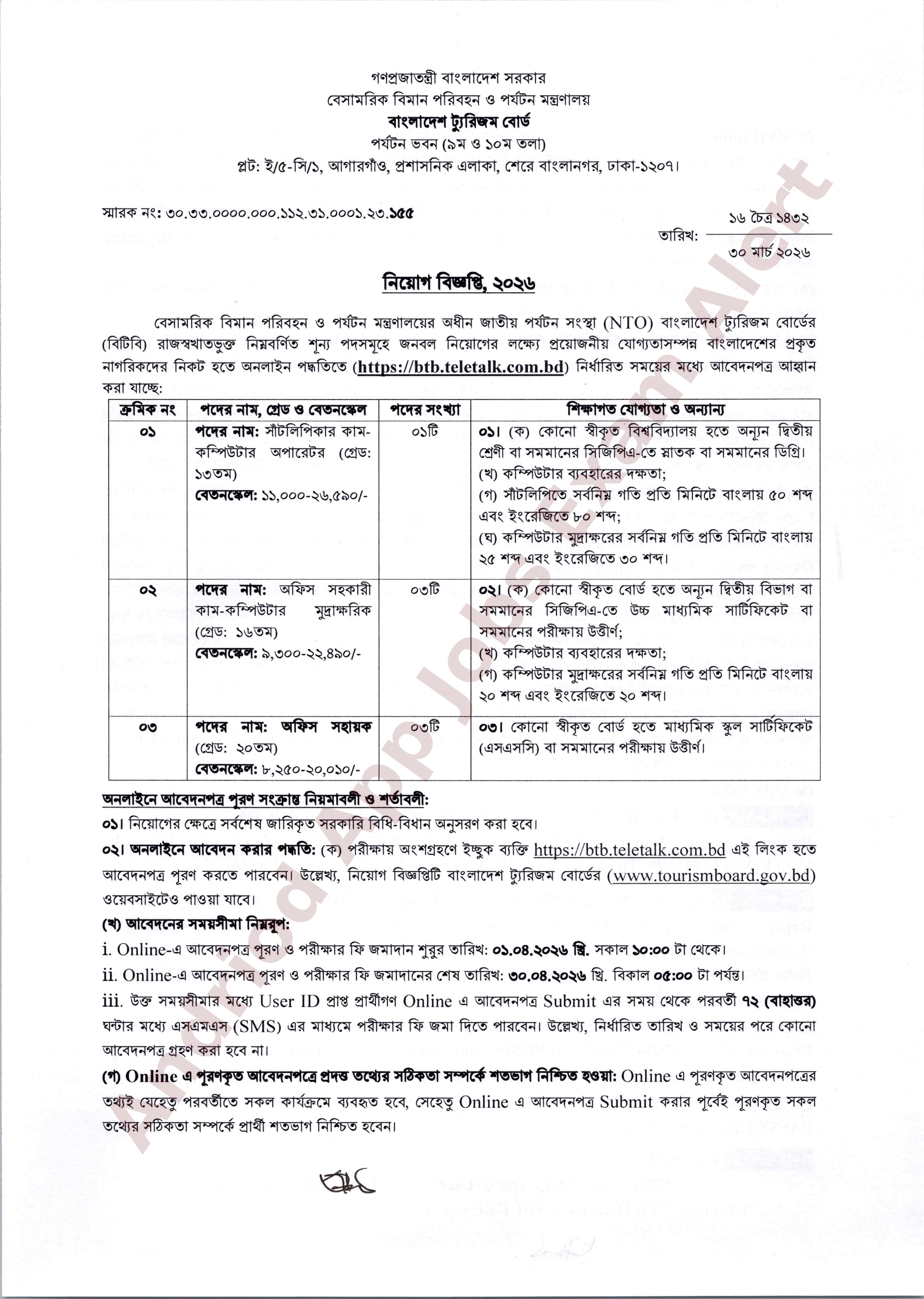 বেসামরিক বিমান পরিবহন ও পর্যটন মন্ত্রণালয়ের অধীন জাতীয় পর্যটন সংস্থা 'বাংলাদেশ ট্যুরিজম বোর্ড' (বিটিবি) তাদের রাজস্বখাতভুক্ত একাধিক পদে জনবল নিয়োগের জন্য বিজ্ঞপ্তি প্রকাশ করেছে। প্রতিষ্ঠানটি ০৩টি ক্যাটাগরিতে মোট ০৭ জনকে নিয়োগ দেবে।