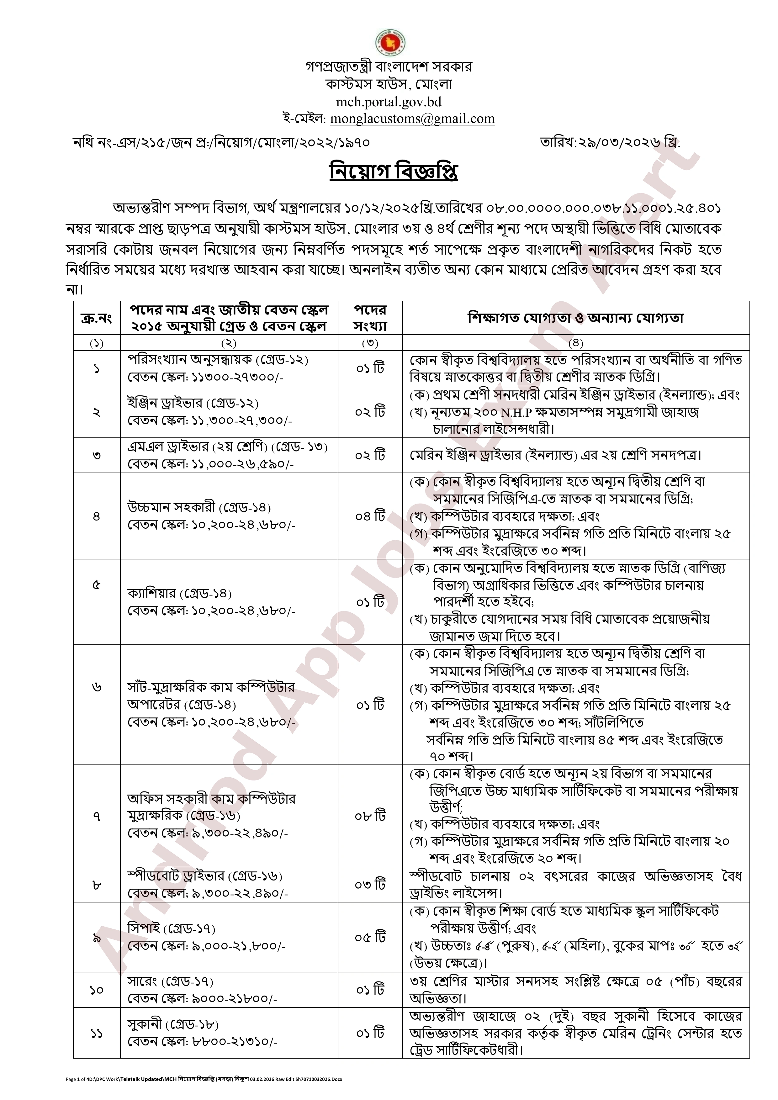 নিয়োগ পরীক্ষার তারিখ, সময় ও স্থান কাস্টমস হাউস, মোংলা-এর ওয়েবসাইট (mch.portal.gov.bd) এবং প্রার্থীর মোবাইল ফোনে এসএমএস-এর মাধ্যমে জানানো হবে।