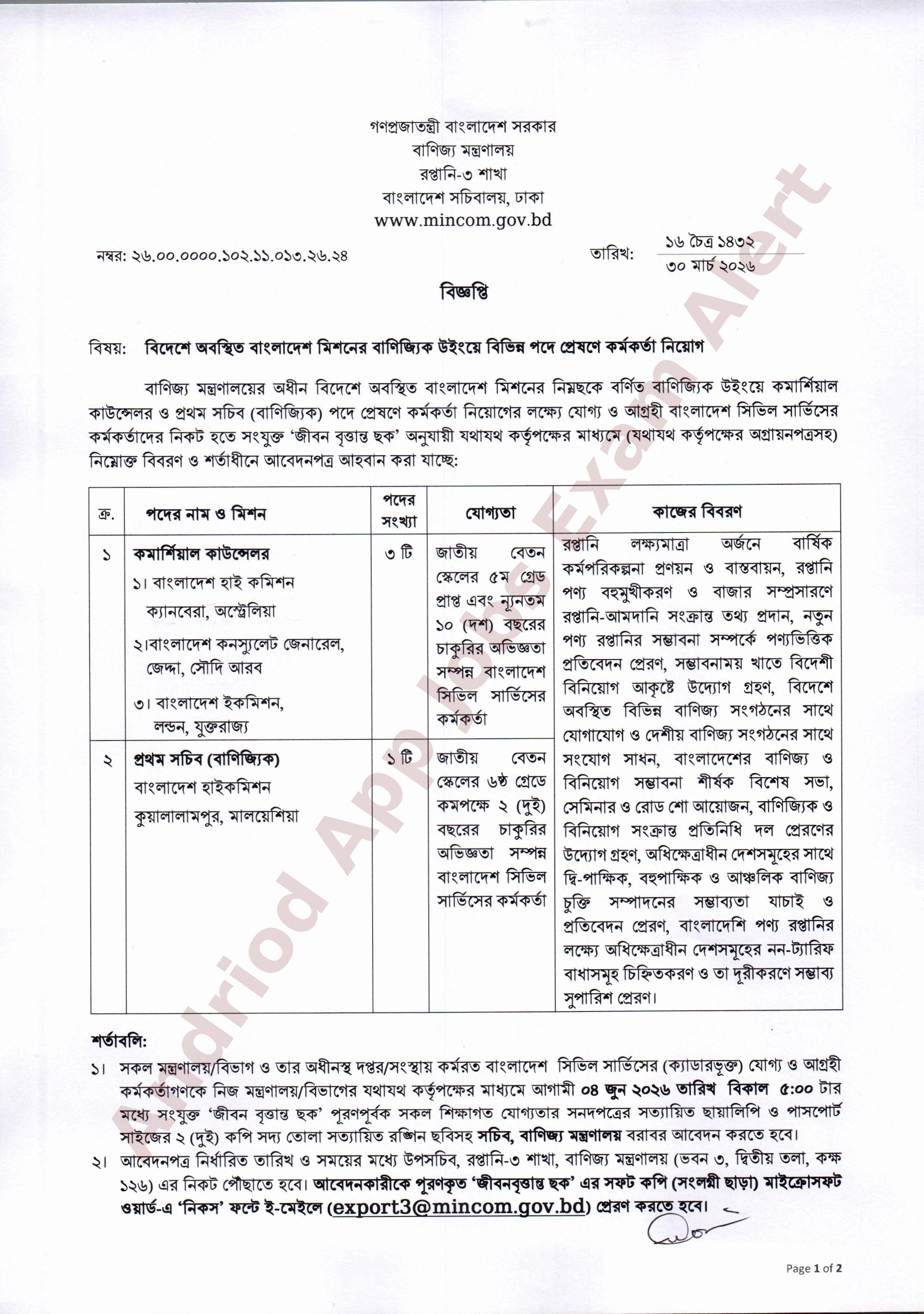 বাণিজ্য মন্ত্রণালয়ের অধীনে বিদেশে অবস্থিত বাংলাদেশ মিশনের বাণিজ্যিক উইংসমূহে প্রেষণে কর্মকর্তা নিয়োগের জন্য বিজ্ঞপ্তি প্রকাশ করা হয়েছে। বিসিএস ক্যাডারভুক্ত যোগ্য ও আগ্রহী কর্মকর্তারা এই পদের জন্য আবেদন করতে পারবেন।