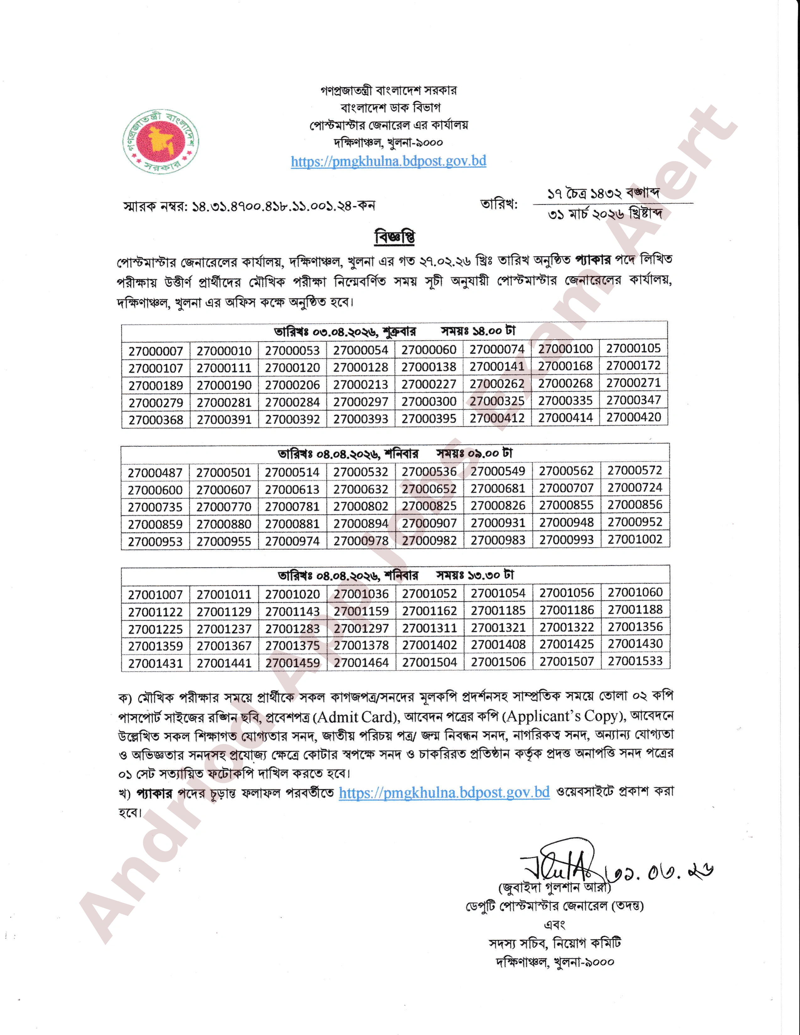 পোস্টমাস্টার জেনারেলের কার্যালয়, দক্ষিণাঞ্চল, খুলনা-এর গত ২৭.০২.২০২৬ তারিখে অনুষ্ঠিত প্যাকার পদের লিখিত পরীক্ষায় উত্তীর্ণ প্রার্থীদের মৌখিক পরীক্ষার সময়সূচী প্রকাশ করা হয়েছে।