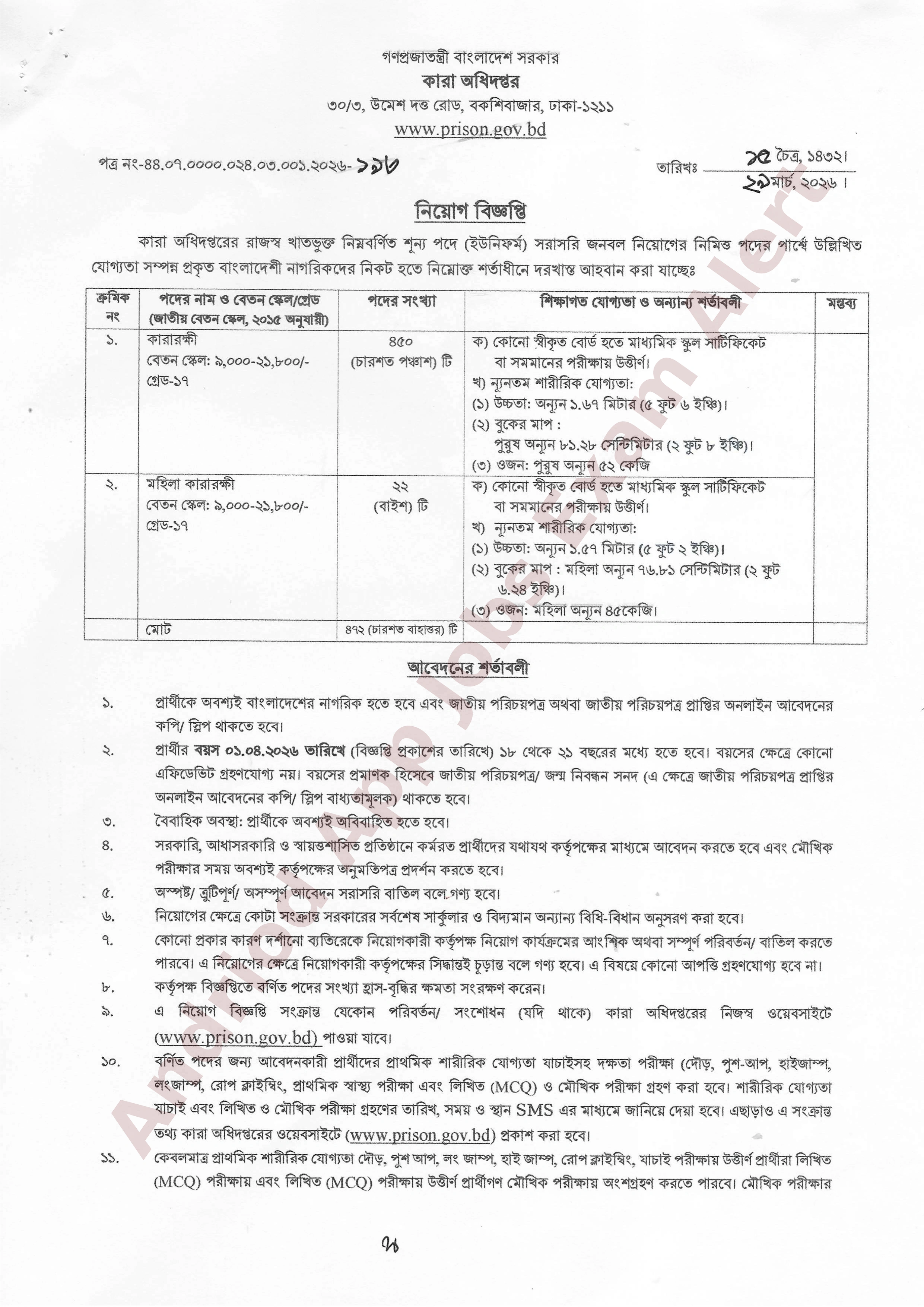 কারা অধিদপ্তর নিয়োগ বিজ্ঞপ্তি ২০২৬ সম্প্রতি কারারক্ষী এবং মহিলা কারারক্ষী পদে জনবল নিয়োগের জন্য একটি বিজ্ঞপ্তি প্রকাশ করেছে (Prisons Job Circular 2026) । আগ্রহী ও যোগ্যতাসম্পন্ন প্রকৃত বাংলাদেশী নাগরিকগণ এই নিয়োগে আবেদন করতে পারবেন।