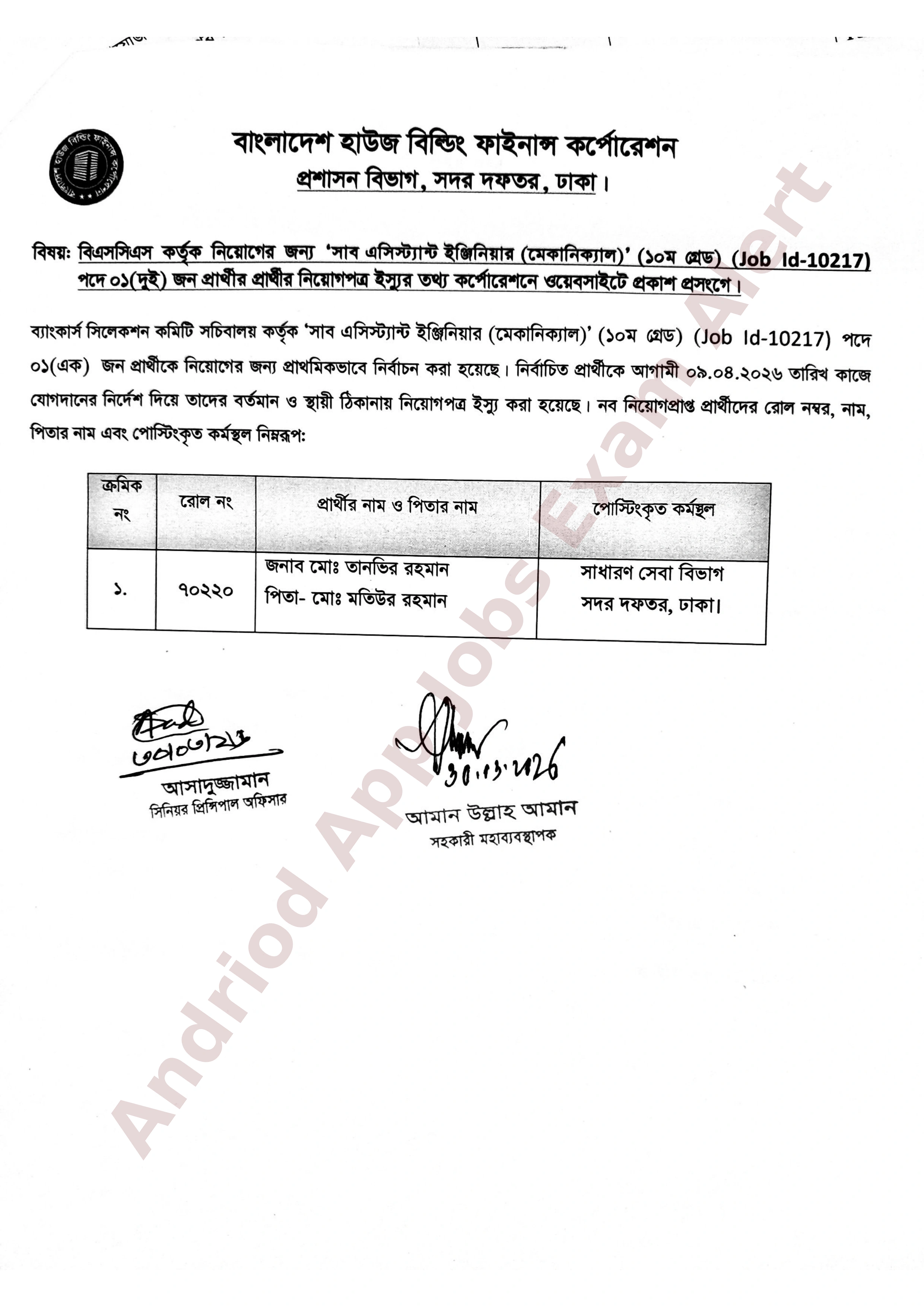 বাংলাদেশ হাউজ বিল্ডিং ফাইনান্স কর্পোরেশনে 'সাব এসিস্ট্যান্ট ইঞ্জিনিয়ার (মেকানিক্যাল)' (১০ম গ্রেড) পদে ০১ (এক) জন প্রার্থীকে নিয়োগের জন্য প্রাথমিকভাবে নির্বাচন করা হয়েছে।