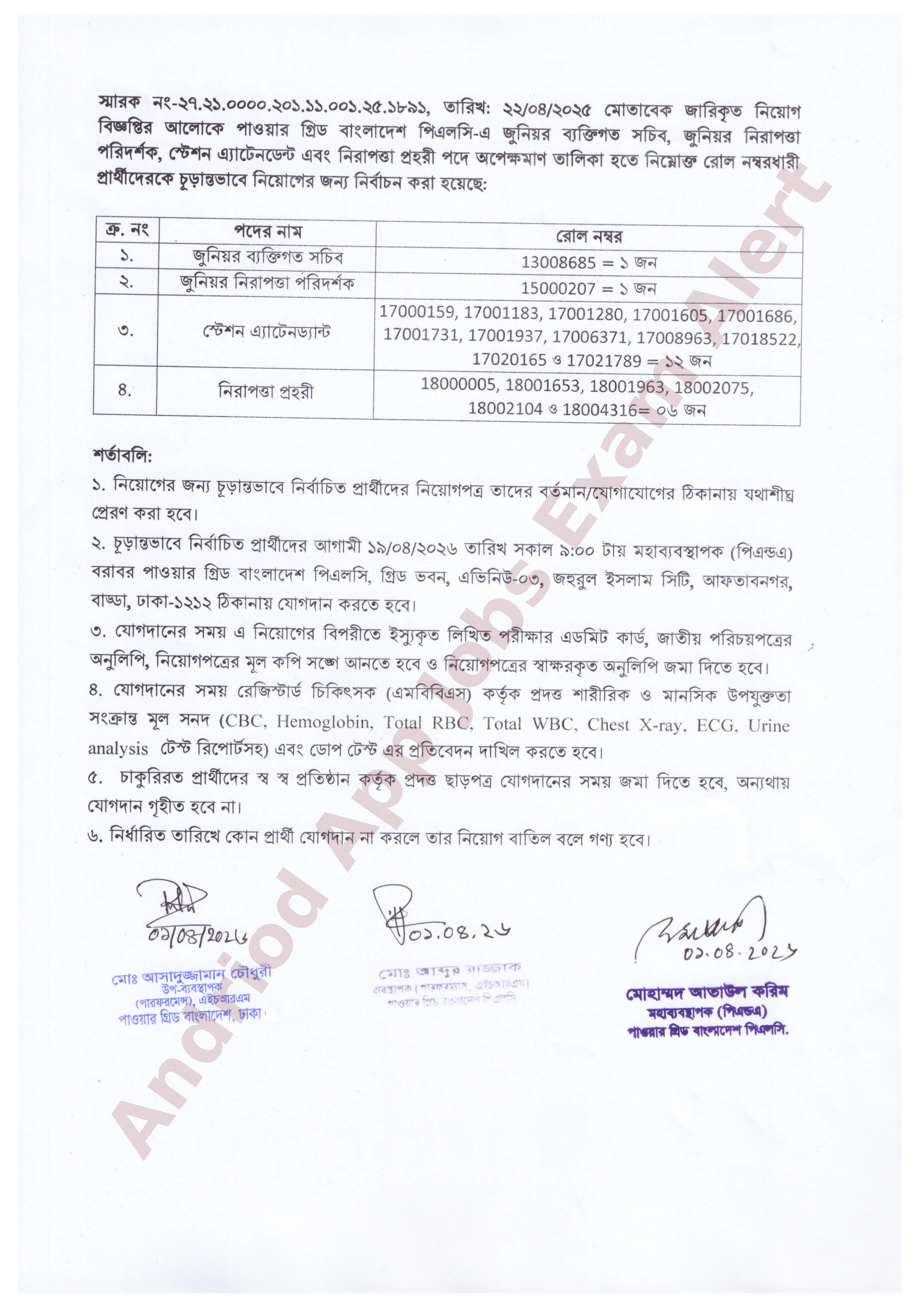 পাওয়ার গ্রিড বাংলাদেশ পিএলসি-এর জুনিয়র ব্যক্তিগত সচিব, জুনিয়র নিরাপত্তা পরিদর্শক, স্টেশন এ্যাটেনডেন্ট এবং নিরাপত্তা প্রহরী পদে অপেক্ষমাণ তালিকা হতে প্রার্থীদের নিয়োগের জন্য নির্বাচন করা হয়েছে। নির্বাচিত প্রার্থীদের নির্দিষ্ট সময় ও স্থানে যোগদান করতে হবে।