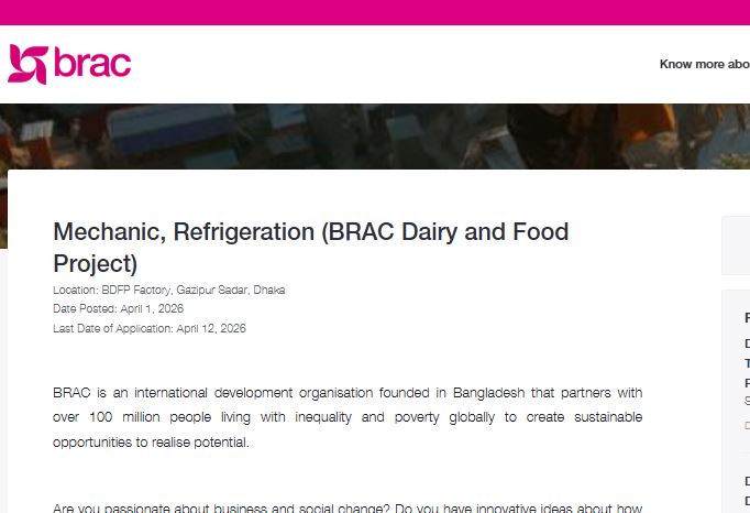 আন্তর্জাতিক উন্নয়ন সংস্থা 'ব্র্যাক' (BRAC)-এর ব্র্যাক এন্টারপ্রাইজের অধীনে 'ব্র্যাক ডেইরি অ্যান্ড ফুড প্রজেক্ট' (BDFP)-এ জনবল নিয়োগের বিজ্ঞপ্তি প্রকাশ করা হয়েছে। প্রতিষ্ঠানটিতে "মেকানিক, রেফ্রিজারেশন" পদে আগ্রহী ও যোগ্য প্রার্থীদের কাছ থেকে আবেদন আহ্বান করা হচ্ছে। BRAC Job Circular 2026, ব্র্যাক নিয়োগ বিজ্ঞপ্তি ২০২৬, এনজিও জব সার্কুলার, NGO Jobs in Bangladesh 2026, Mechanic Jobs BD, Refrigeration Mechanic, Gazipur Jobs, BD Jobs, ব্র্যাক ডেইরি নিয়োগ. যারা স্বনামধন্য এনজিওতে টেকনিক্যাল পেশায় ক্যারিয়ার গড়তে চান, তাদের জন্য এটি একটি চমৎকার সুযোগ।