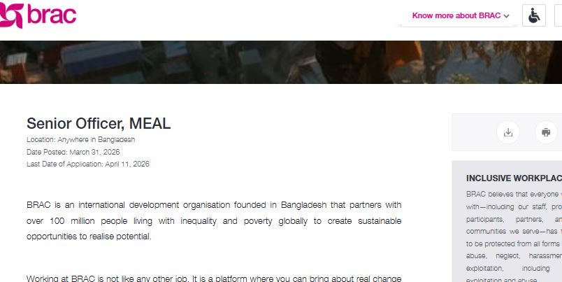 - পদের নাম: সিনিয়র অফিসার, MEAL (Monitoring, Evaluation, Accountability, and Learning)