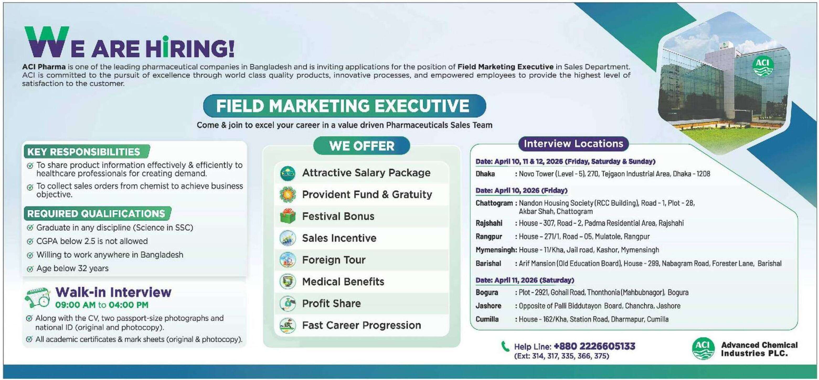 বাংলাদেশের অন্যতম শীর্ষস্থানীয় ফার্মাসিউটিক্যাল কোম্পানি এসিআই ফার্মা (Advanced Chemical Industries PLC) তাদের সেলস ডিপার্টমেন্টের জন্য "ফিল্ড মার্কেটিং এক্সিকিউটিভ" (Field Marketing Executive) পদে জনবল নিয়োগের একটি মেগা বিজ্ঞপ্তি প্রকাশ করেছে।