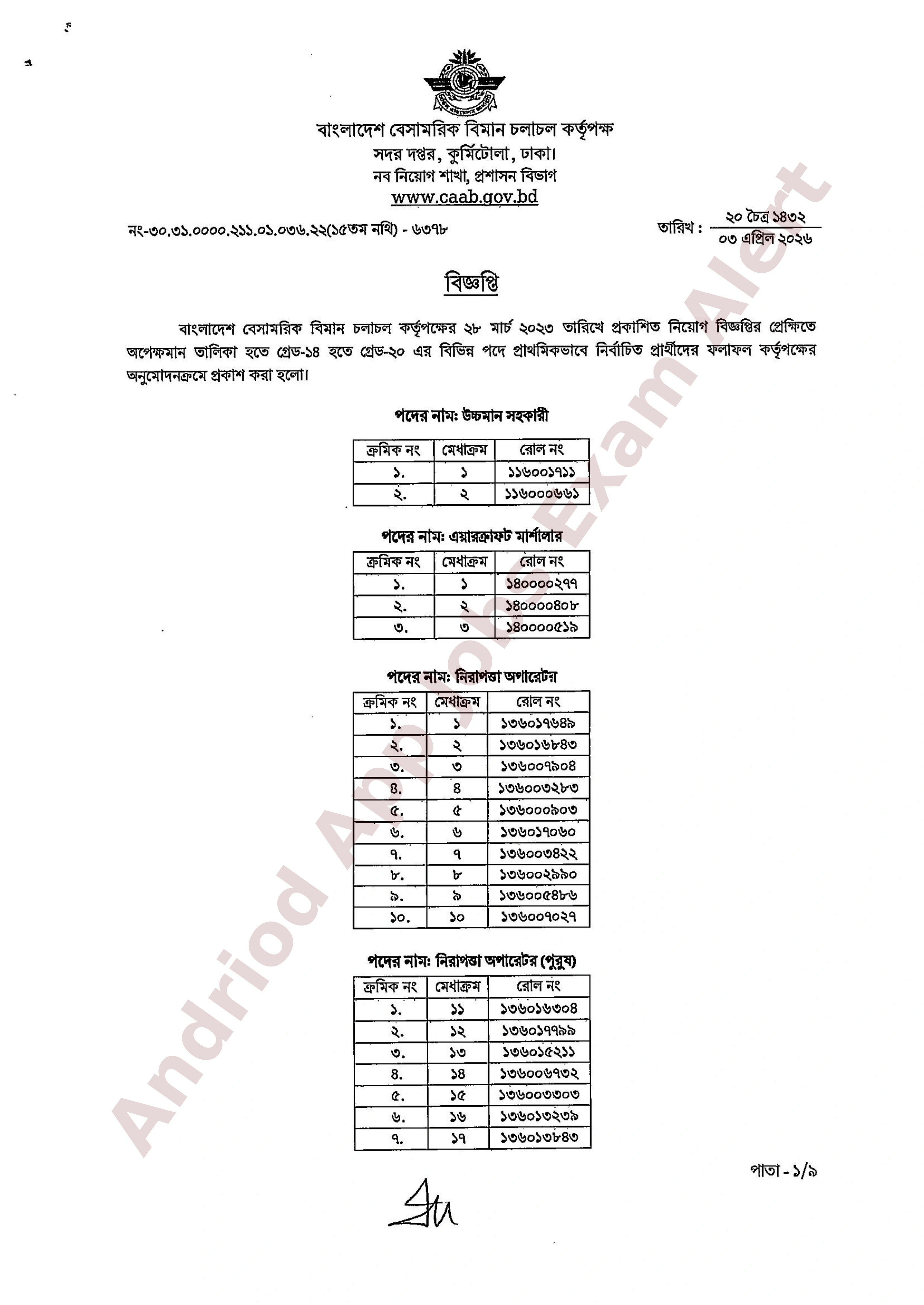 বাংলাদেশ বেসামরিক বিমান চলাচল কর্তৃপক্ষের (সিএএবি) ২৮ মার্চ ২০২৩ তারিখে প্রকাশিত নিয়োগ বিজ্ঞপ্তির প্রেক্ষিতে অপেক্ষমাণ তালিকা হতে বিভিন্ন পদের ফলাফল প্রকাশ করা হয়েছে। গ্রেড-১৪ হতে গ্রেড-২০ ভুক্ত বিভিন্ন পদে প্রার্থীদের প্রাথমিকভাবে নির্বাচন করা হয়েছে।