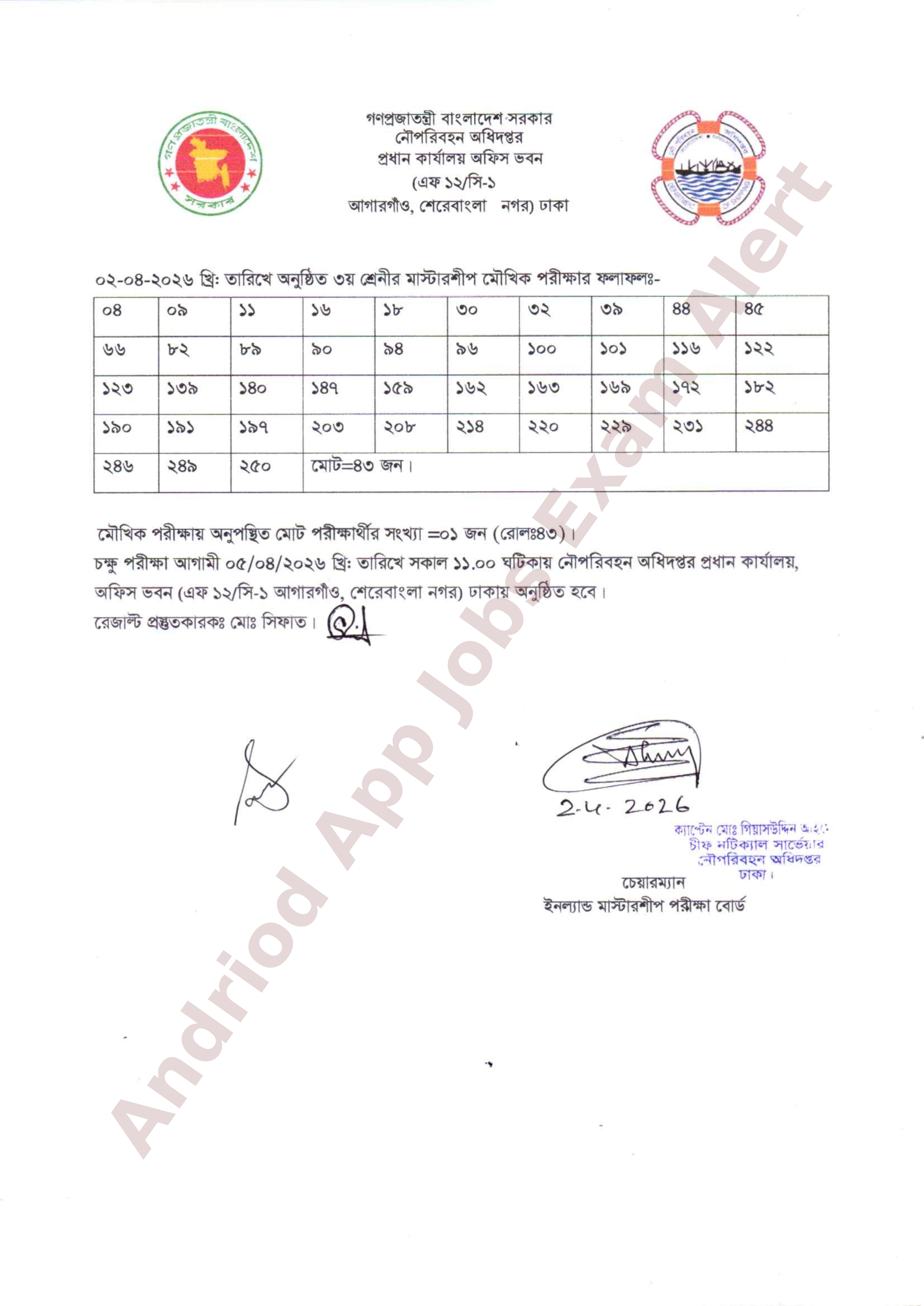 পরীক্ষার স্থান: নৌপরিবহন অধিদপ্তর প্রধান কার্যালয়, অফিস ভবন (এফ ১২/সি-১ আগারগাঁও, শেরেবাংলা নগর), ঢাকা।