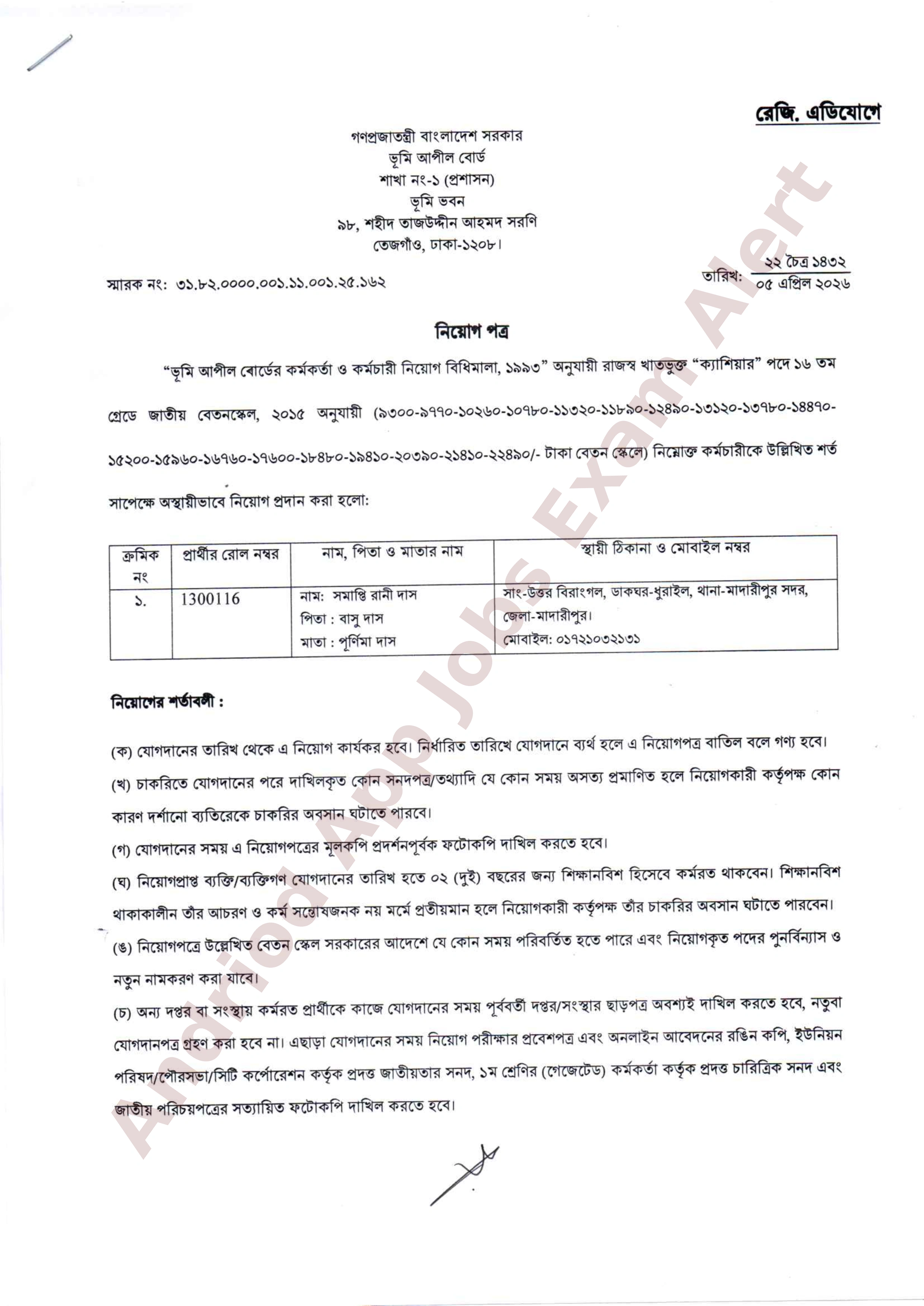 ভূমি আপীল বোর্ড রাজস্ব খাতভুক্ত ১৬ তম গ্রেডের শূন্য পদে জনবল নিয়োগের চূড়ান্ত ফলাফল ও নিয়োগপত্র প্রকাশ করেছে। বিজ্ঞপ্তিতে উল্লিখিত শর্ত সাপেক্ষে নির্বাচিত প্রার্থীকে সাময়িকভাবে নিয়োগ প্রদান করা হয়েছে।