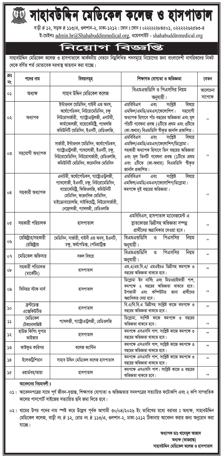 রাজধানী ঢাকার গুলশানে অবস্থিত স্বনামধন্য শাহাবুদ্দিন মেডিকেল কলেজ ও হাসপাতাল (Shahabuddin Medical College & Hospital) তাদের বিভিন্ন বিভাগে জনবল নিয়োগের জন্য এক বিশাল নিয়োগ বিজ্ঞপ্তি প্রকাশ করেছে। আকর্ষণীয় বেতন ও সুন্দর কর্মপরিবেশে কাজ করতে আগ্রহী যোগ্য বাংলাদেশী নাগরিকদের নিকট থেকে দরখাস্ত আহ্বান করা হচ্ছে।