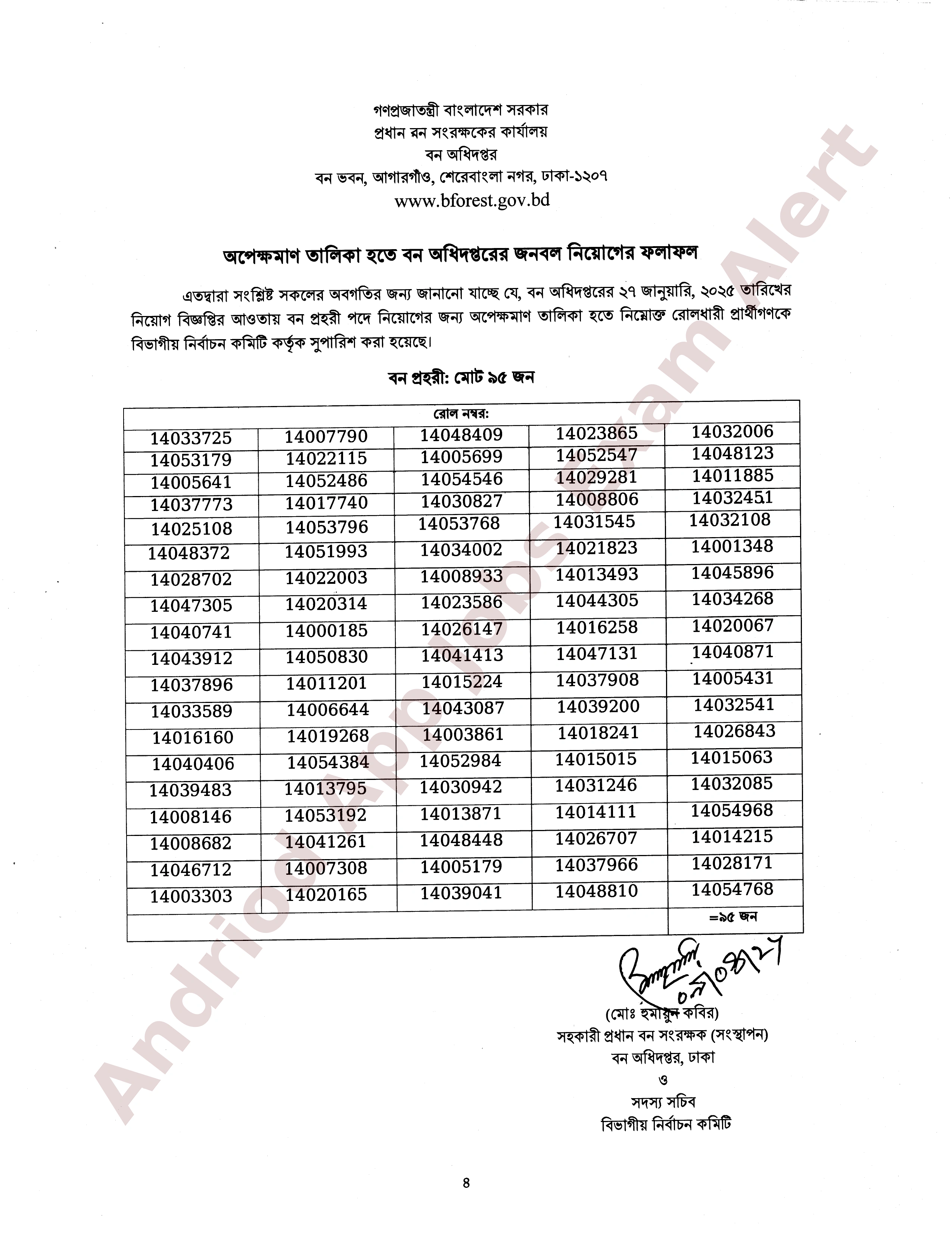 ২০২৫ তারিখের নিয়োগ বিজ্ঞপ্তির আওতায় বন প্রহরী পদে নিয়োগের জন্য অপেক্ষমাণ তালিকা হতে মোট ৯৫ জন প্রার্থীকে বিভাগীয় নির্বাচন কমিটি কর্তৃক সুপারিশ করা হয়েছে।বিস্তারিত নিচের বিজ্ঞপ্তিতে দেখুনঃ