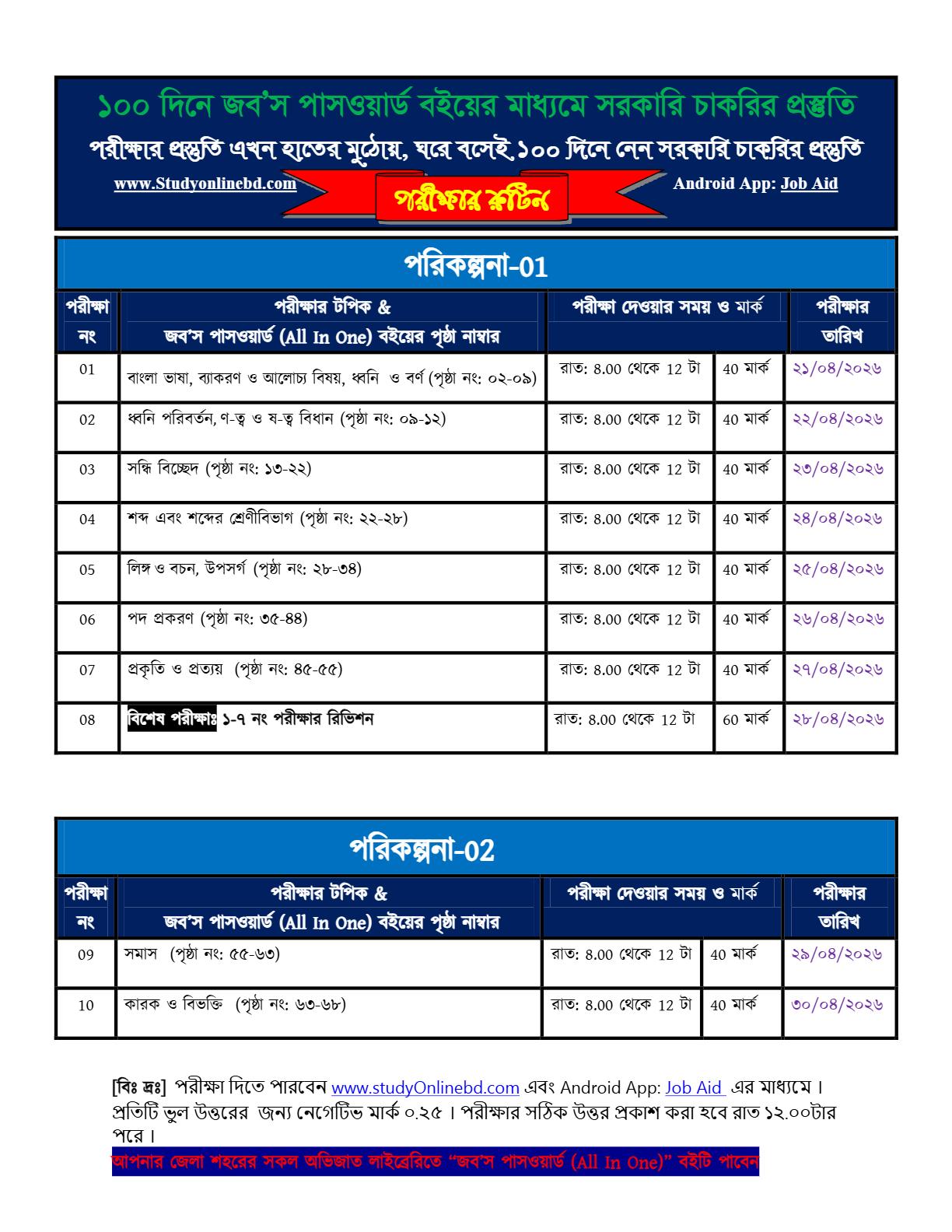 জব'স পাসওয়ার্ড বইটির মূল্যঃ ৪৫০ টাকা। সেই সাথে প্রতিটা মেম্বারের জন্য আলাদা ১০০ দিনের পরীক্ষার রুটিন পরিকল্পনা করা হয়েছে । আপনি যে দিন বইটি ক্রয় করবেন এবং পরীক্ষার রুটিন ডাউনলোড দিবেন, সেই দিন থেকে আপনার জন্য ১০০ দিনের পরীক্ষার রুটিন তৈরি হবে এবং আপনি ১০০ দিনে বইটি শেষ করতে পারবেন।