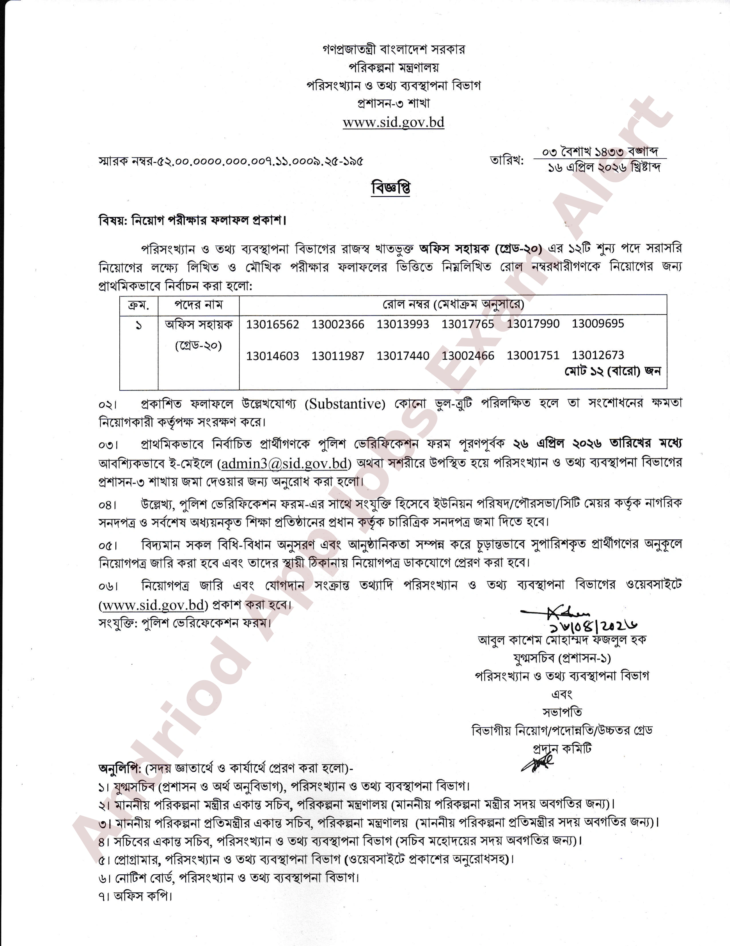 পরিকল্পনা মন্ত্রণালয়ের পরিসংখ্যান ও তথ্য ব্যবস্থাপনা বিভাগের রাজস্ব খাতভুক্ত অফিস সহায়ক পদের নিয়োগ পরীক্ষার চূড়ান্ত ফলাফল প্রকাশ করা হয়েছে। লিখিত ও মৌখিক পরীক্ষার ফলাফলের ভিত্তিতে মোট ১২ জন প্রার্থীকে প্রাথমিকভাবে নির্বাচনের জন্য মনোনীত করা হয়েছে।