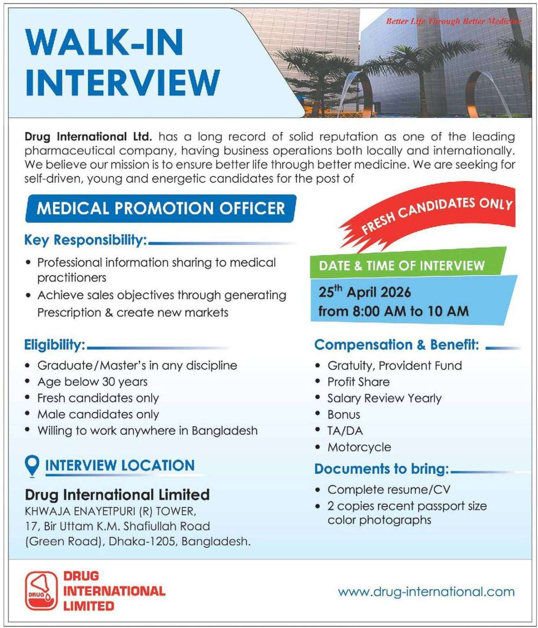 সরাসরি সাক্ষাৎকারে ড্রাগ ইন্টারন্যাশনাল লিমিটেড-এ নিয়োগ বিজ্ঞপ্তি প্রকাশ